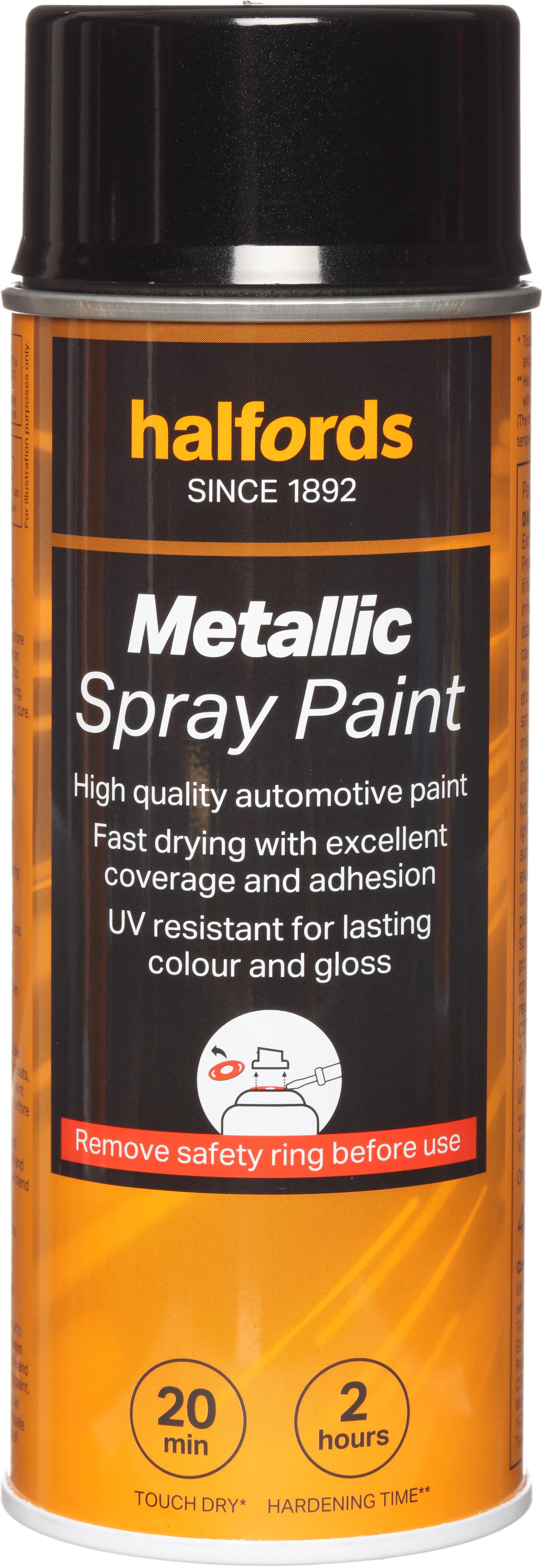 The Halfords Black Metallic Spray Paint is an acrylic-based spray paint, perfect for repairing damage and respraying car panels. It can also be used on aluminium, steel, wood, stone, and most plastics with an appropriate primer.
