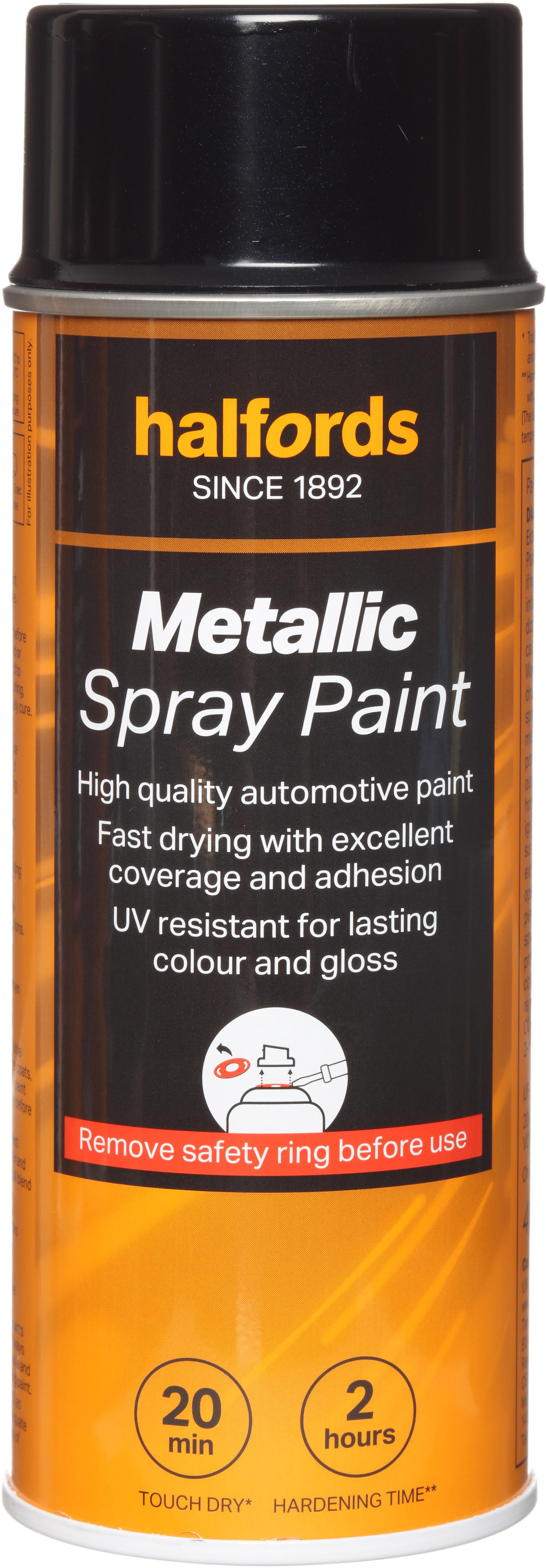 The Halfords Black Metallic Spray Paint is an acrylic-based spray paint, perfect for repairing damage and respraying car panels. It can also be used on aluminium, steel, wood, stone, and most plastics with an appropriate primer.