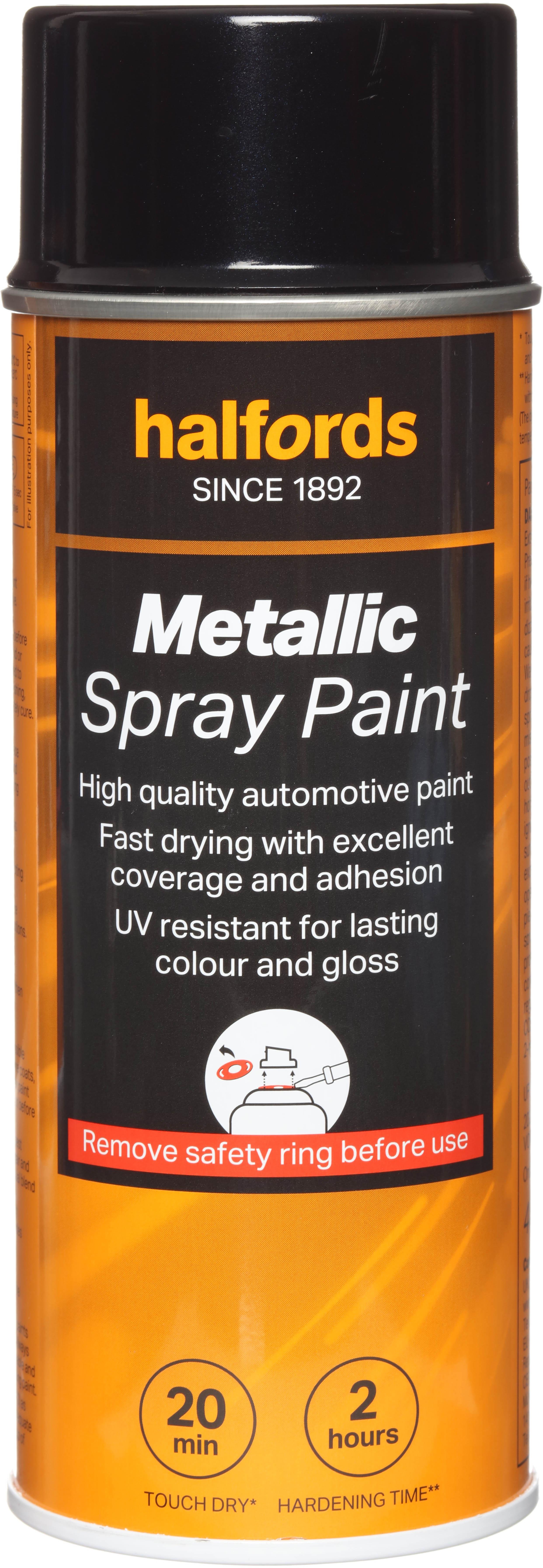 The Halfords Black Metallic Spray Paint is an acrylic-based spray paint, perfect for repairing damage and respraying car panels. It can also be used on aluminium, steel, wood, stone, and most plastics with an appropriate primer.
