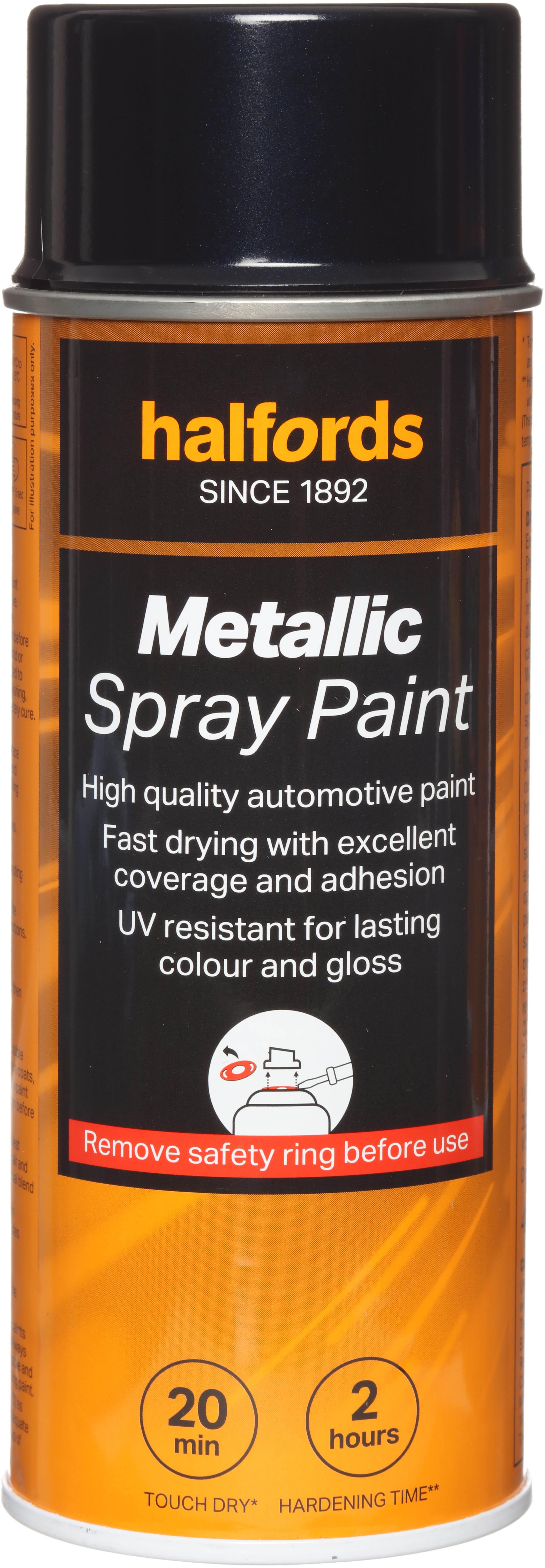 The Halfords Black Metallic Spray Paint is an acrylic-based spray paint, perfect for repairing damage and respraying car panels. It can also be used on aluminium, steel, wood, stone, and most plastics with an appropriate primer.