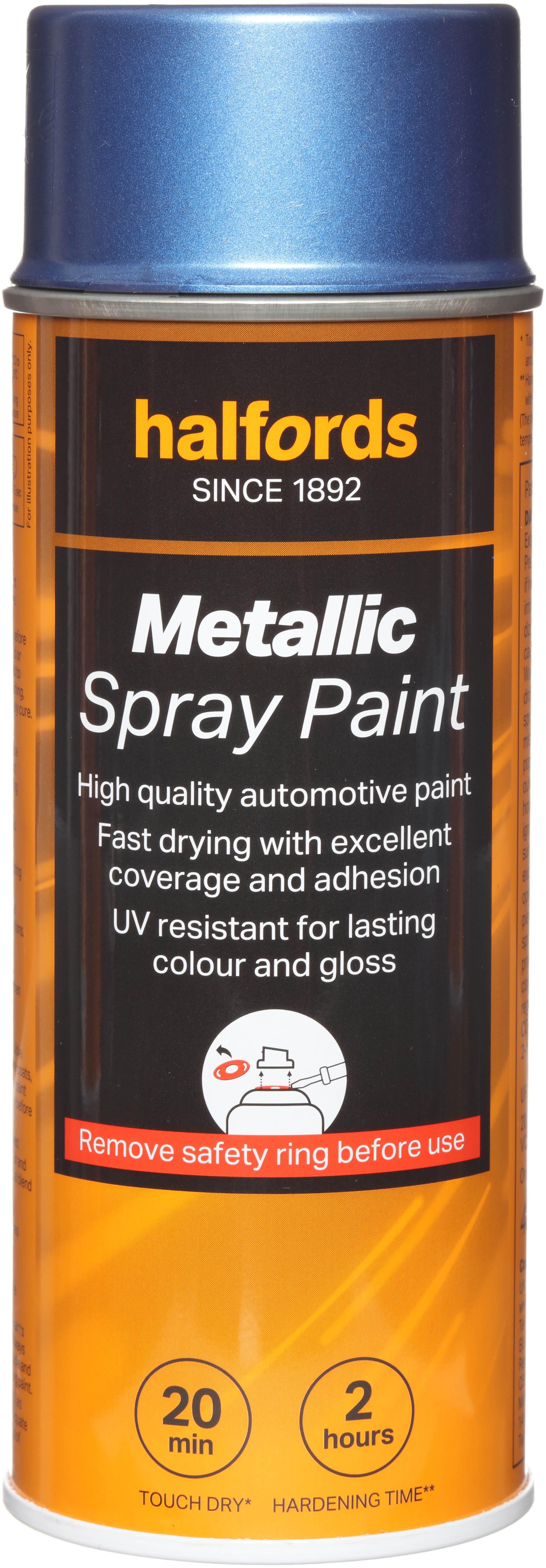 The Halfords Blue Metallic Spray Paint is an automotive-grade spray paint. It’s acrylic-based, and can be used on almost all vehicle finishes as well as steel, aluminium, most plastics, wood & stone.