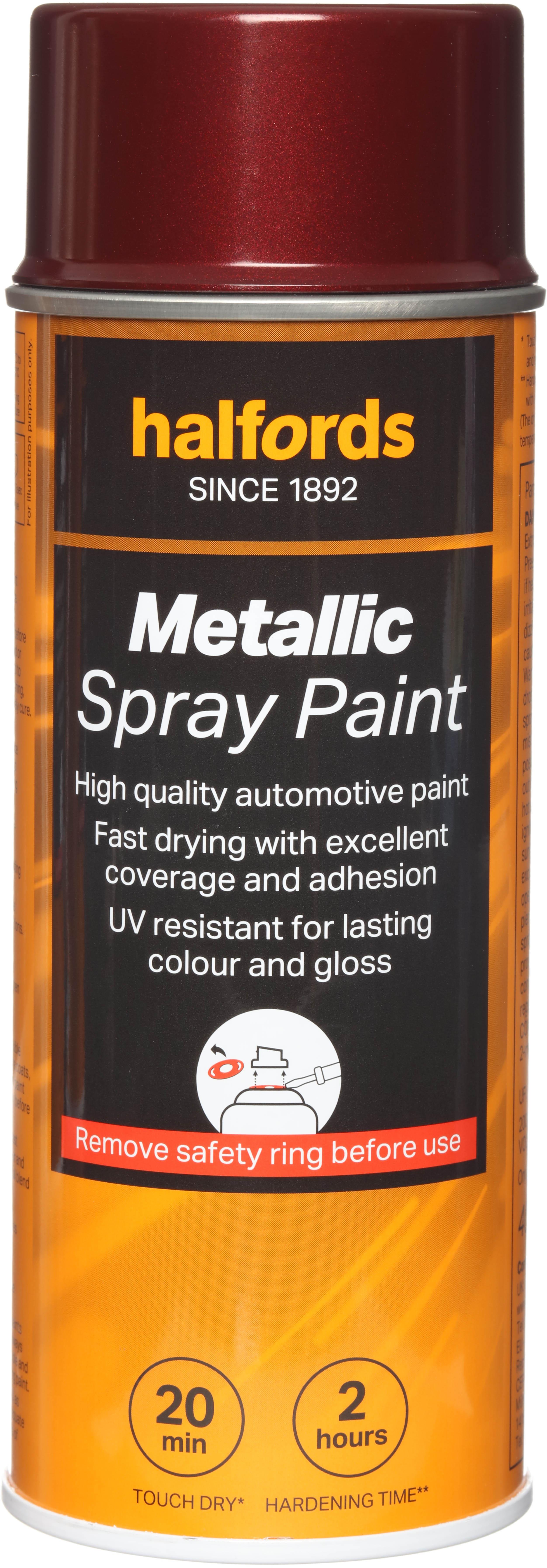 The Halfords Red Metallic Spray Paint is an acrylic-based spray paint, perfect for repairing damage and respraying car panels. It can also be used on aluminium, steel, wood, stone, and most plastics with an appropriate primer.