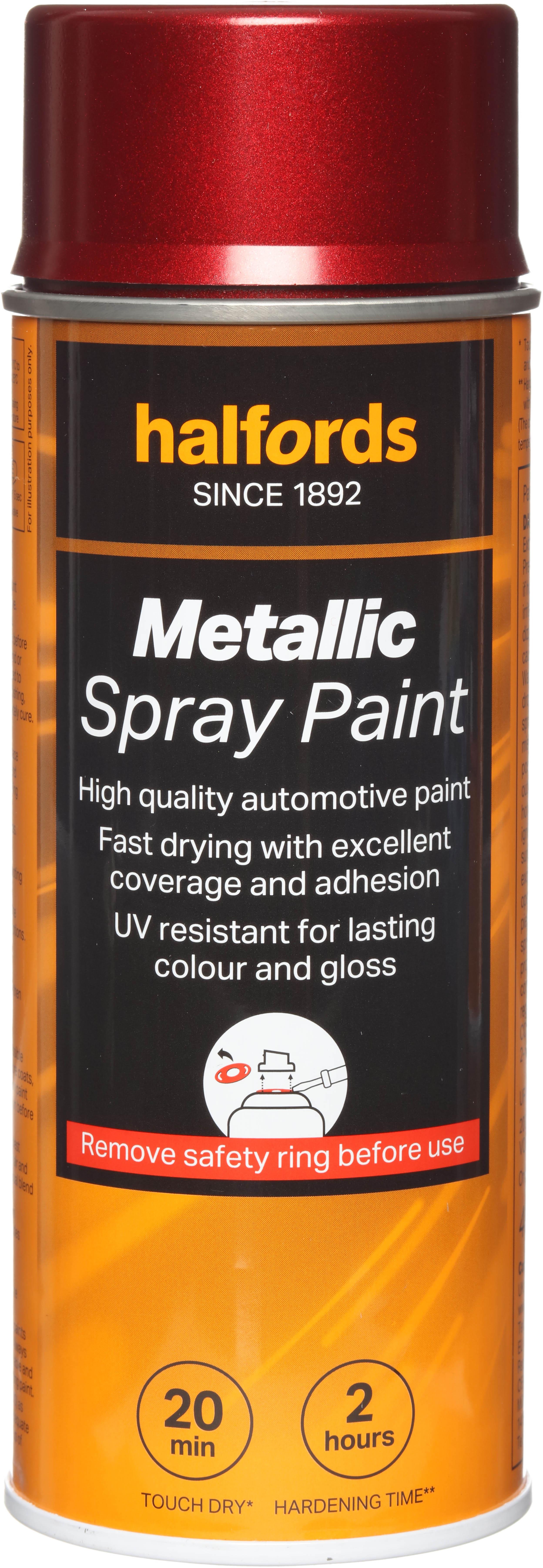 The Halfords Red Metallic Spray Paint is an acrylic-based spray paint, perfect for repairing damage and respraying car panels. It can also be used on aluminium, steel, wood, stone, and most plastics with an appropriate primer.