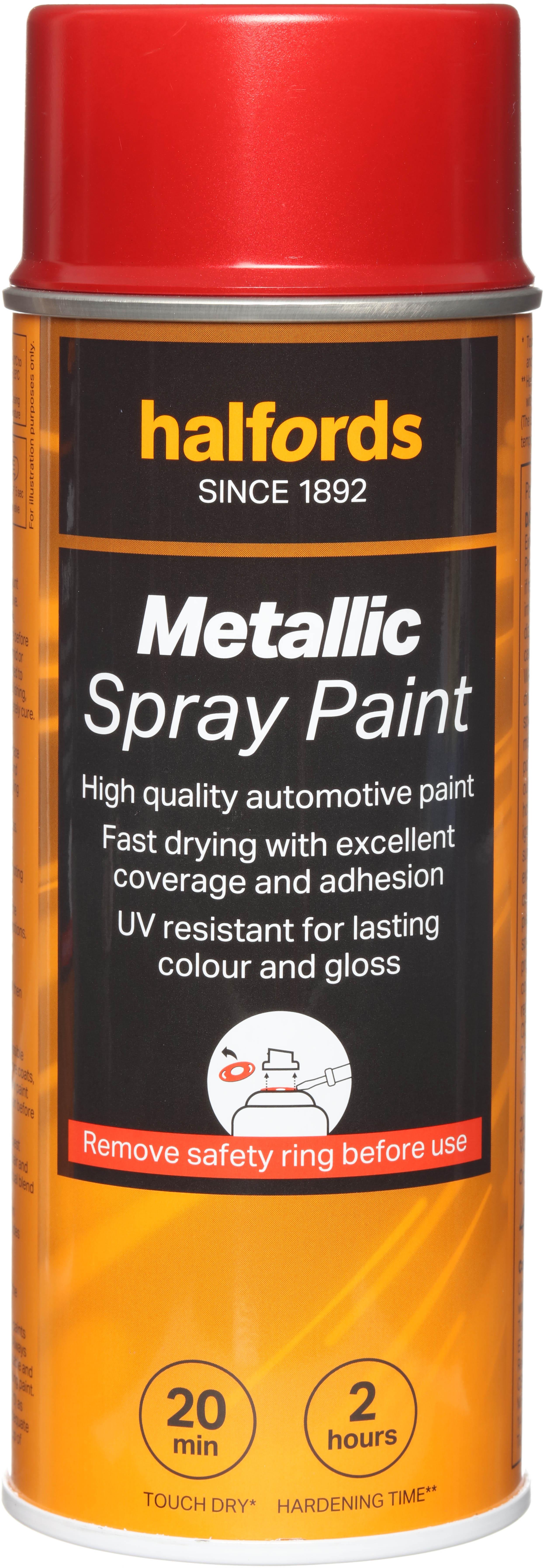 The Halfords Red Metallic Spray Paint is an acrylic-based spray paint, perfect for repairing damage and respraying car panels. It can also be used on aluminium, steel, wood, stone, and most plastics with an appropriate primer.