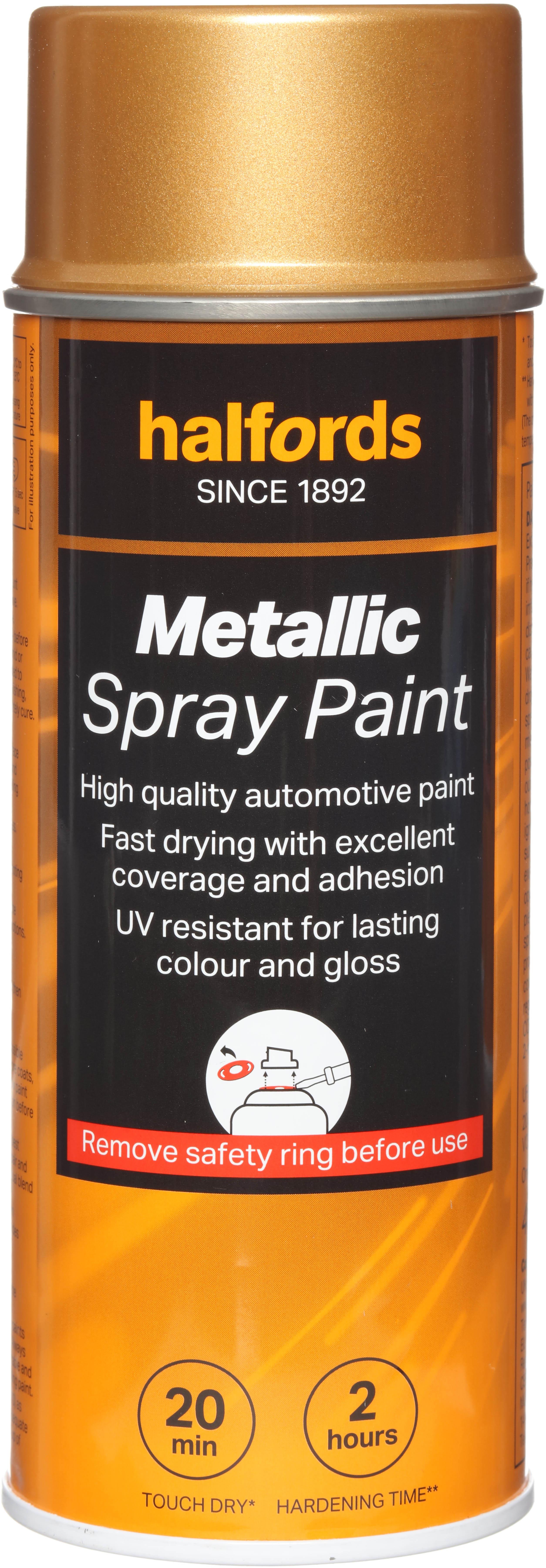 The Halfords Gold Metallic Spray Paint is an automotive-grade spray paint. It’s acrylic-based, and can be used on almost all vehicle finishes as well as steel, aluminium, most plastics, wood & stone.