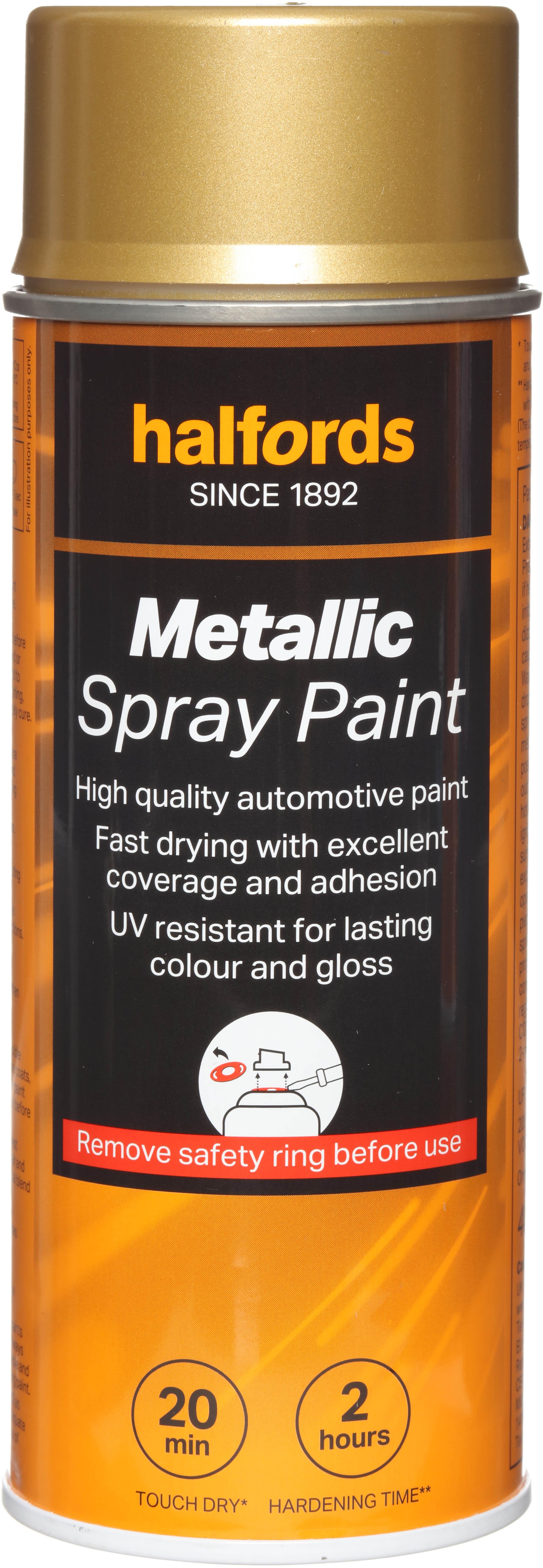 The Halfords Gold Metallic Spray Paint is an automotive-grade spray paint. It’s acrylic-based, and can be used on almost all vehicle finishes as well as steel, aluminium, most plastics, wood & stone.