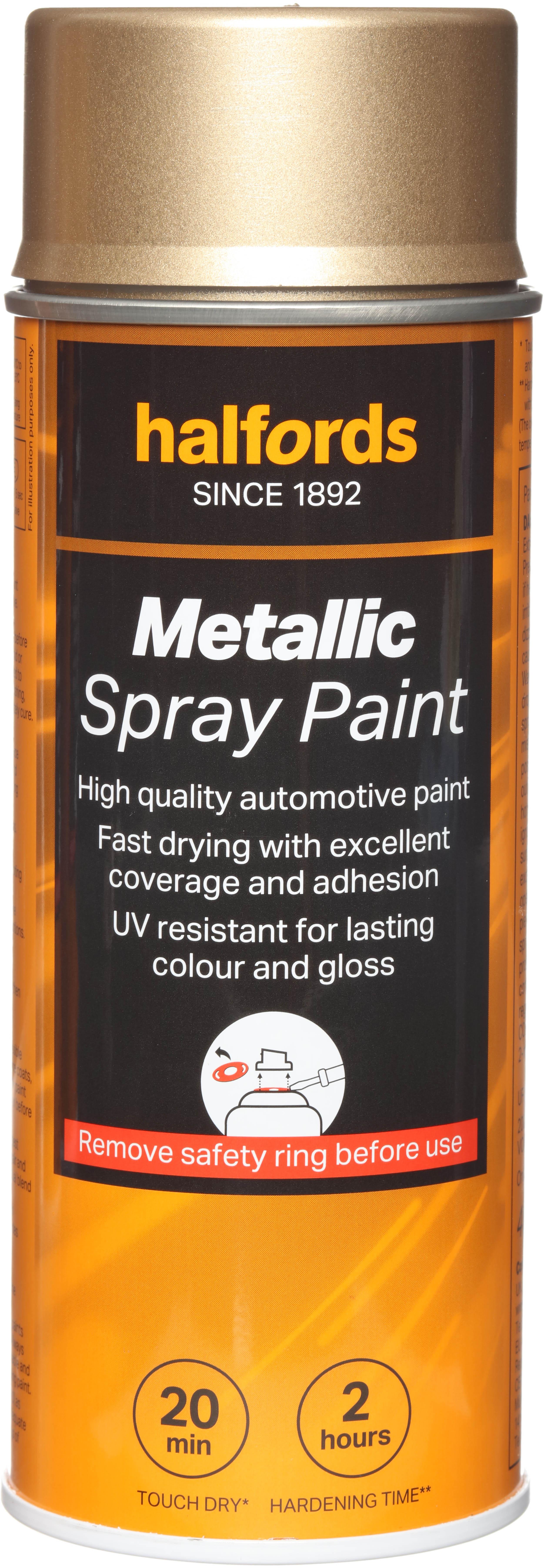 The Halfords Gold Metallic Spray Paint is an automotive-grade spray paint. It’s acrylic-based, and can be used on almost all vehicle finishes as well as steel, aluminium, most plastics, wood & stone.