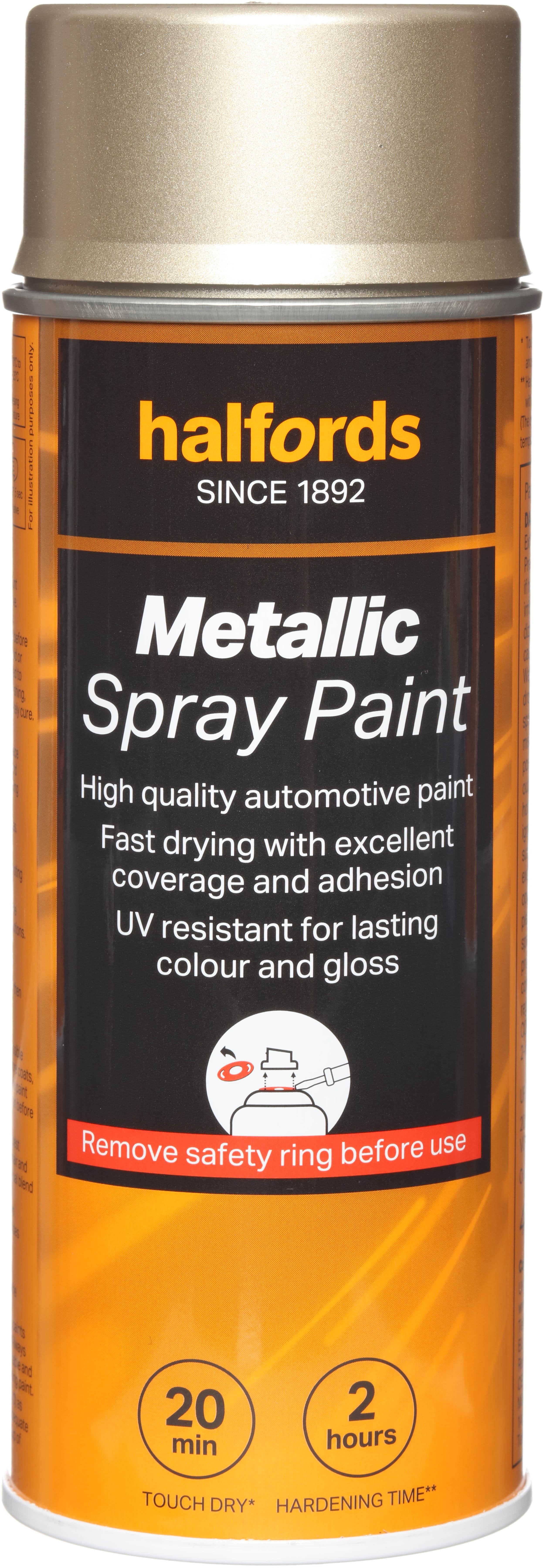 The Halfords Gold Metallic Spray Paint is an automotive-grade spray paint. It’s acrylic-based, and can be used on almost all vehicle finishes as well as steel, aluminium, most plastics, wood & stone.