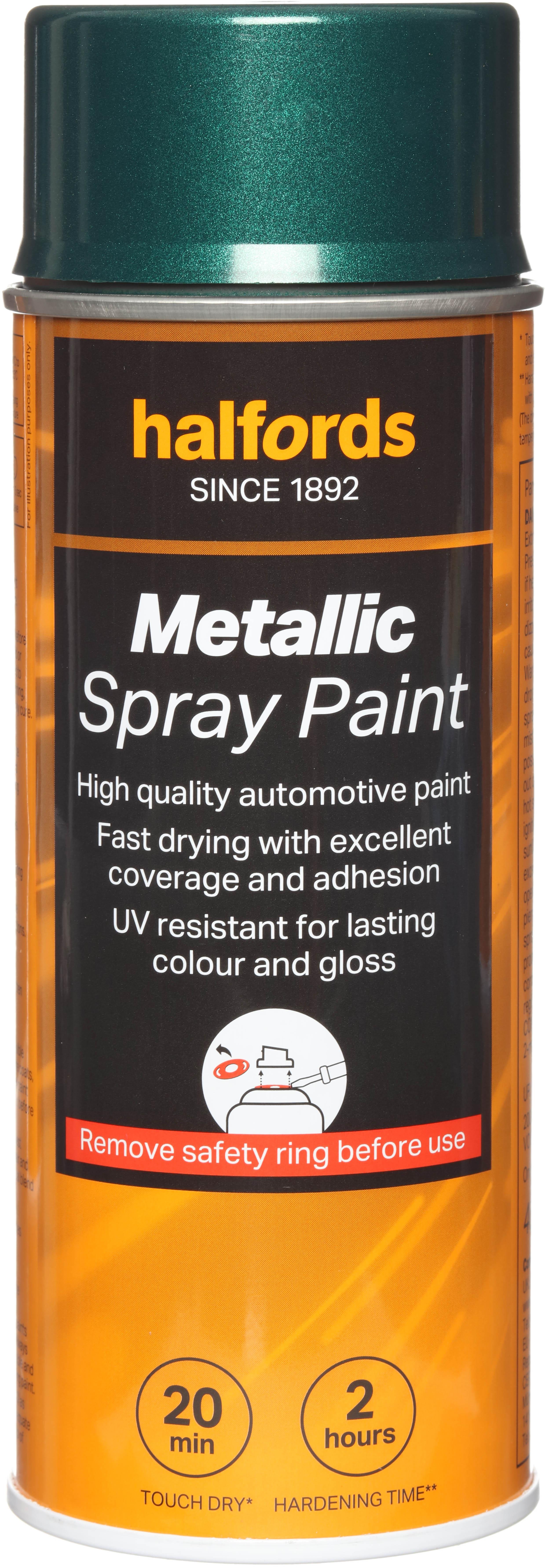 The Halfords Green Metallic Spray Paint is an automotive-grade spray paint. It’s acrylic-based, and can be used on almost all vehicle finishes as well as steel, aluminium, most plastics, wood & stone.