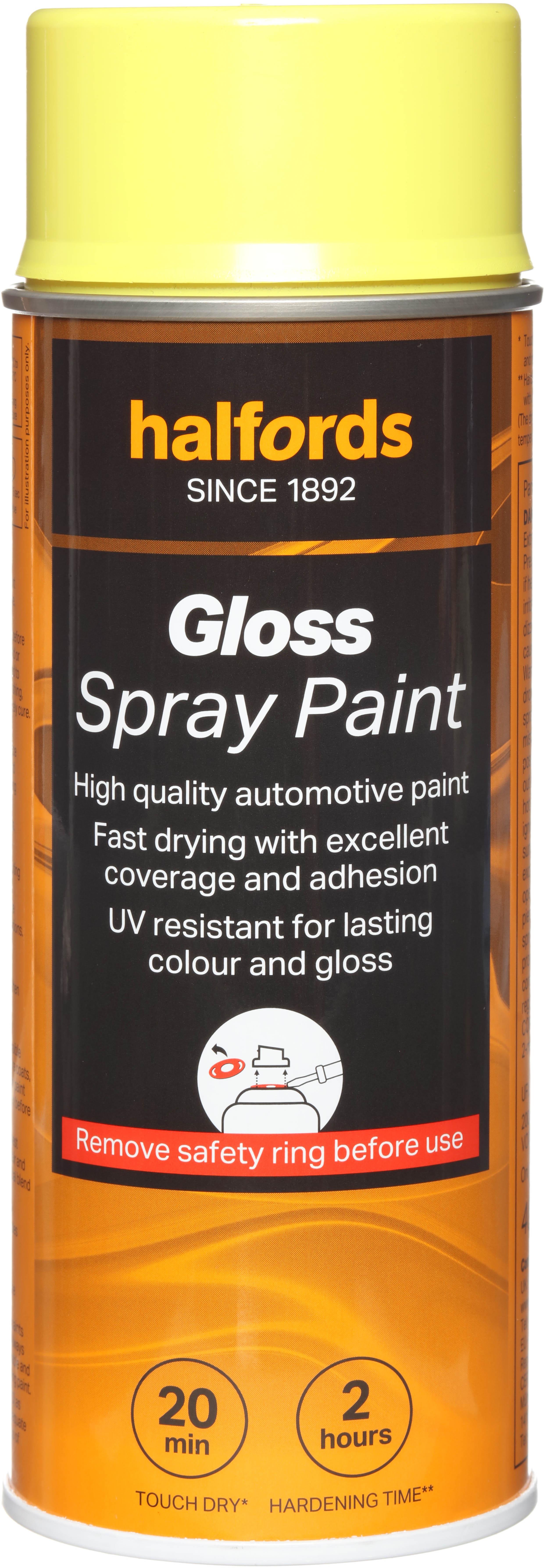 The Halfords Yellow Gloss Spray Paint is an automotive-grade spray paint. It’s acrylic-based, and can be used on almost all vehicle finishes as well as steel, aluminium, most plastics, wood & stone.