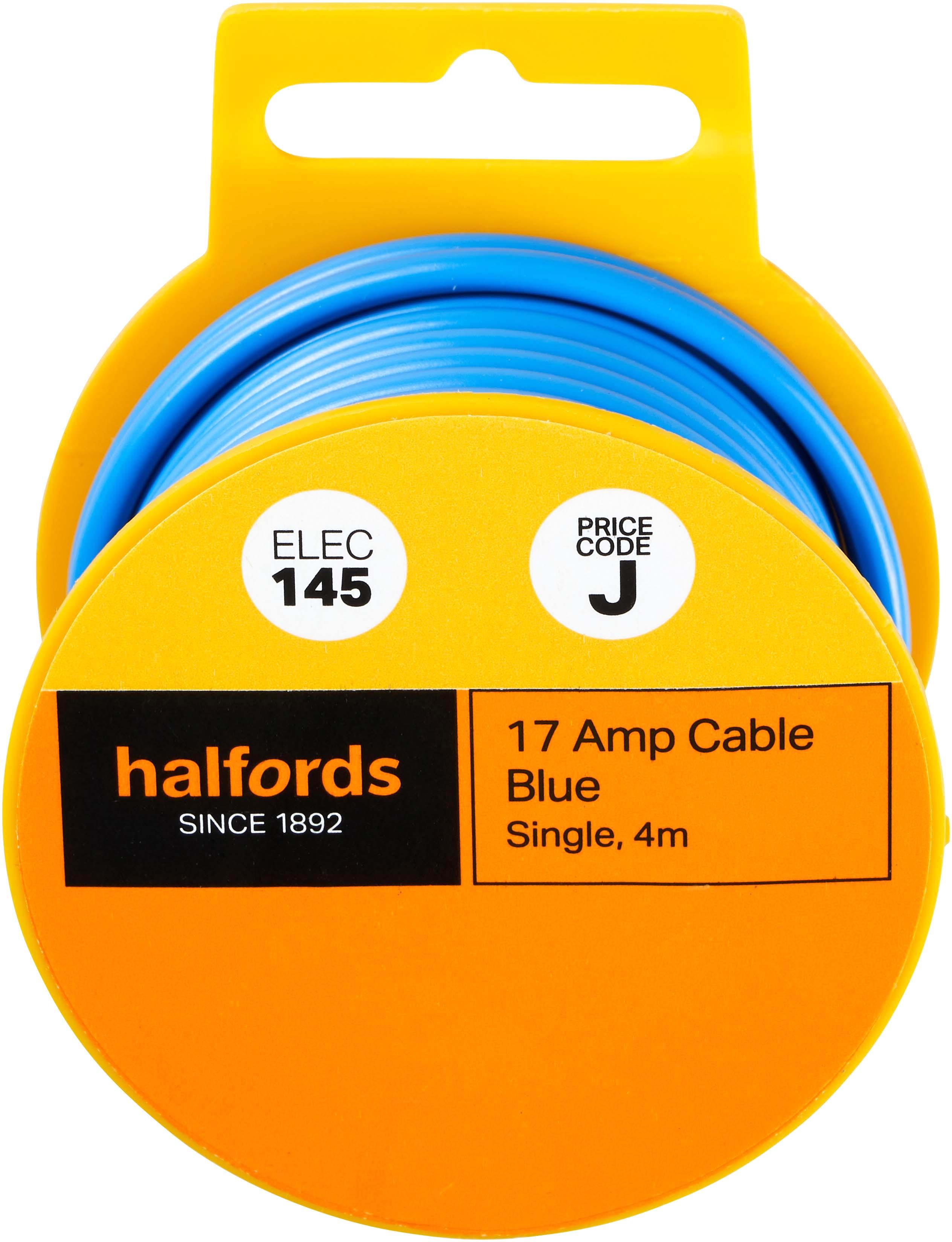 The Halfords 17 Amp Cable Blue (ELEC145) is suitable for high output headlamps, halogen fog lamps, rear screen heaters and wiper motors. Suitable for High Output Headlamps, Halogen Fog Lamps, Rear Screen Heaters and Wiper Motors.