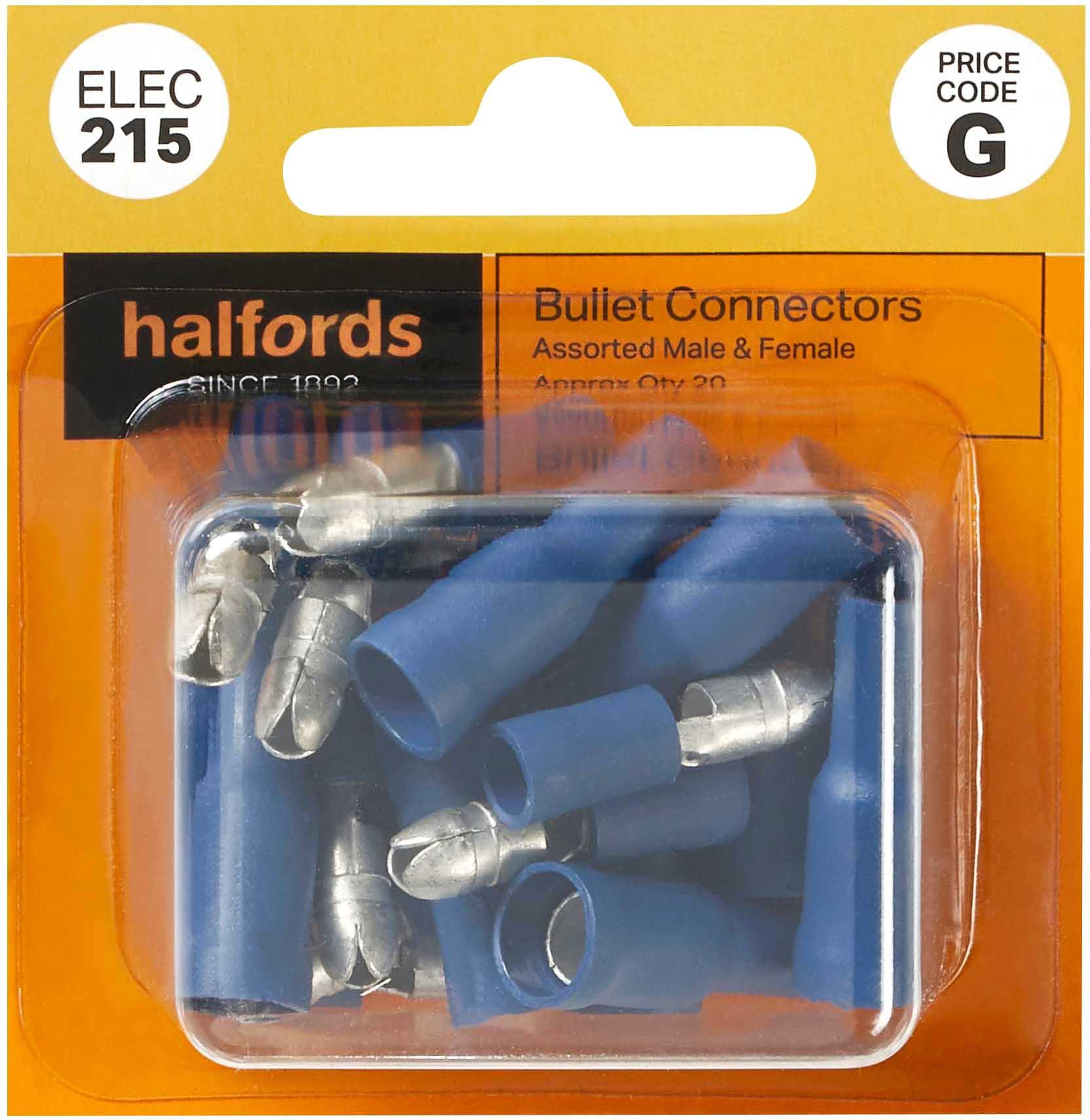 The Halfords Assorted Bullet Connectors (ELEC215) pack, contains both male & female bullet connectors.