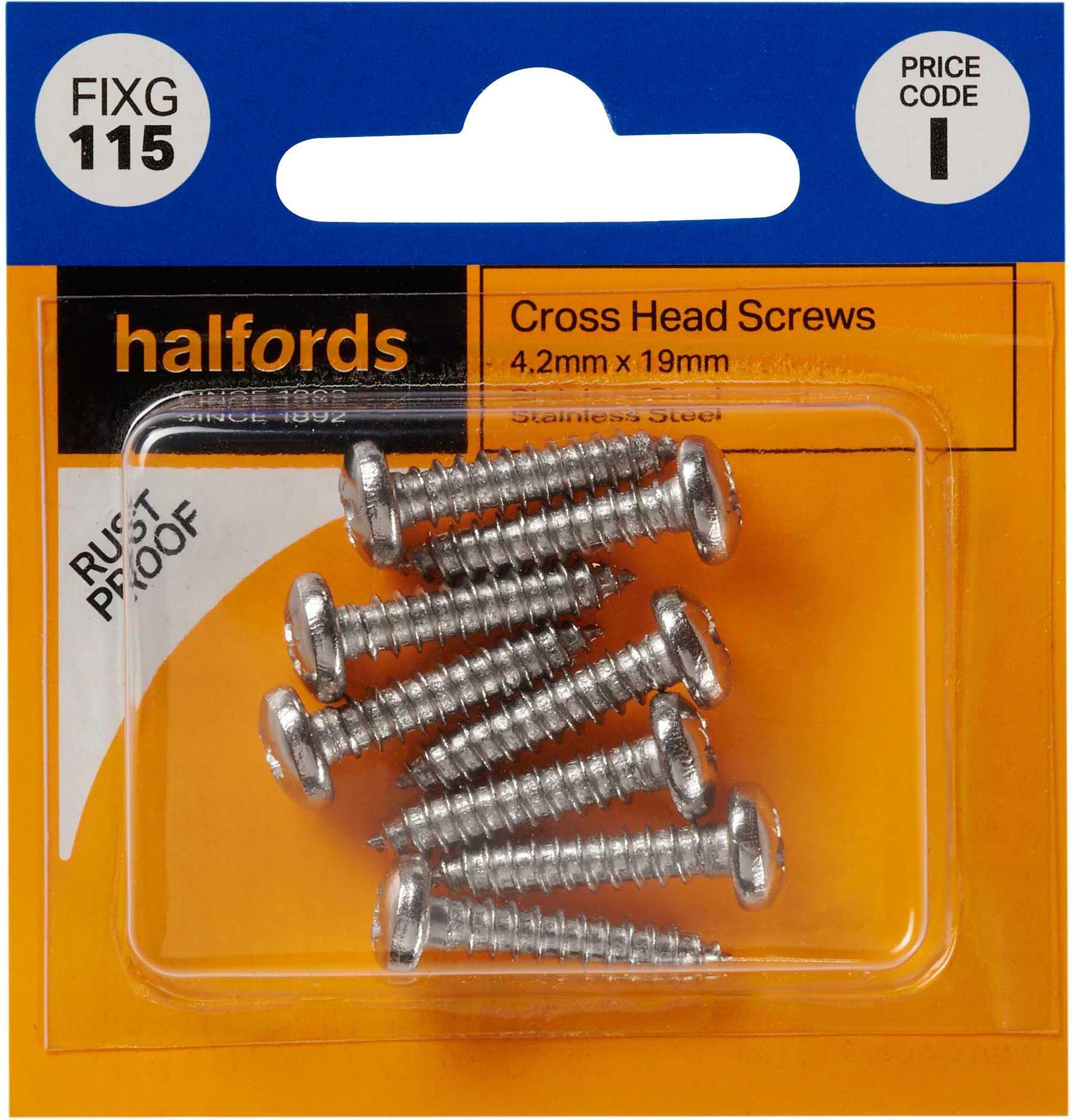 The Halfords Cross Head Screws (FIXG115) pack, contains 8 x 4.2mmx19mm cross head screws.