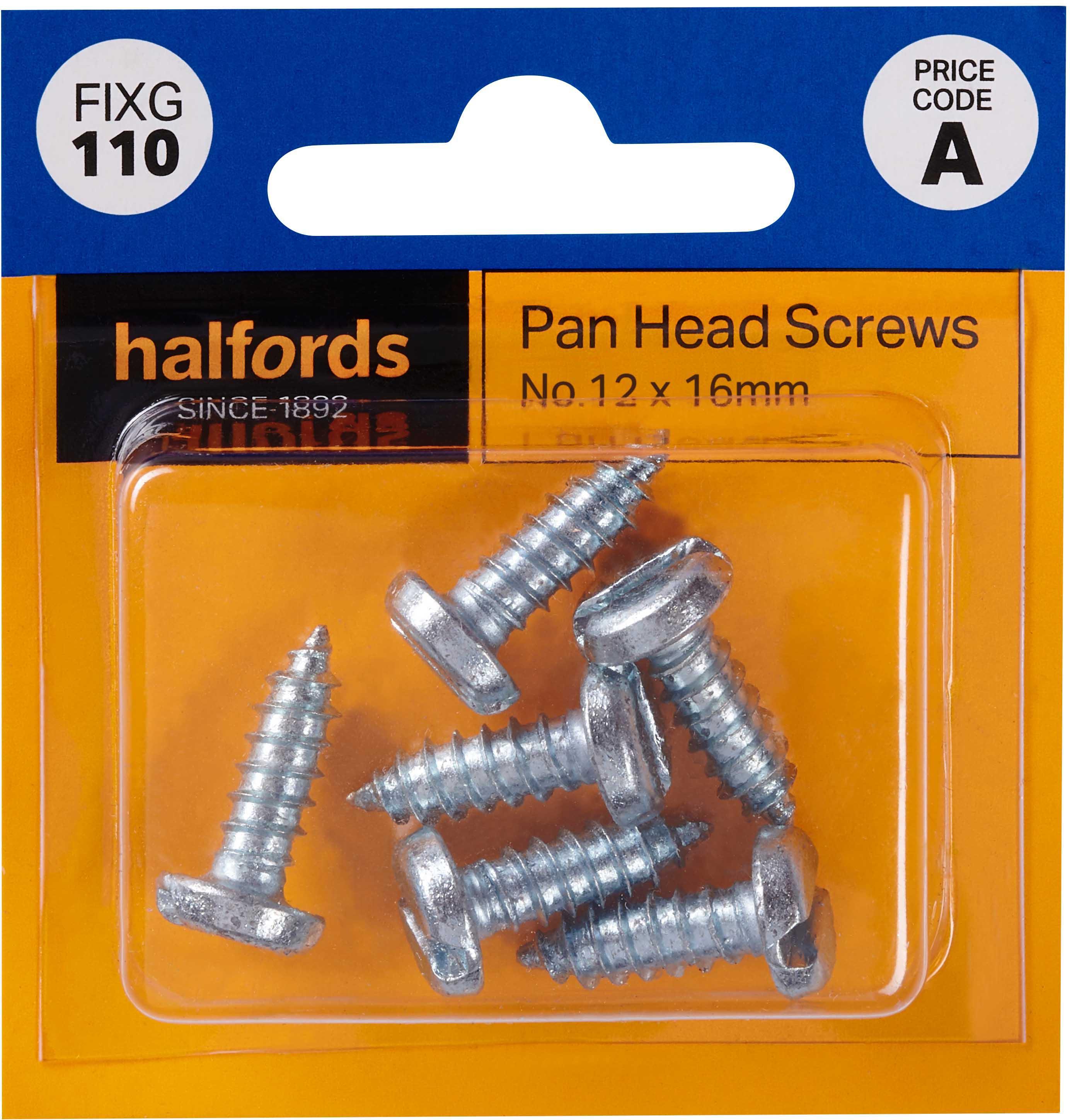 The Halfords Pan head Screws (FIXG110) pack contains 5 x No. 12 x 16mm pan head screws.