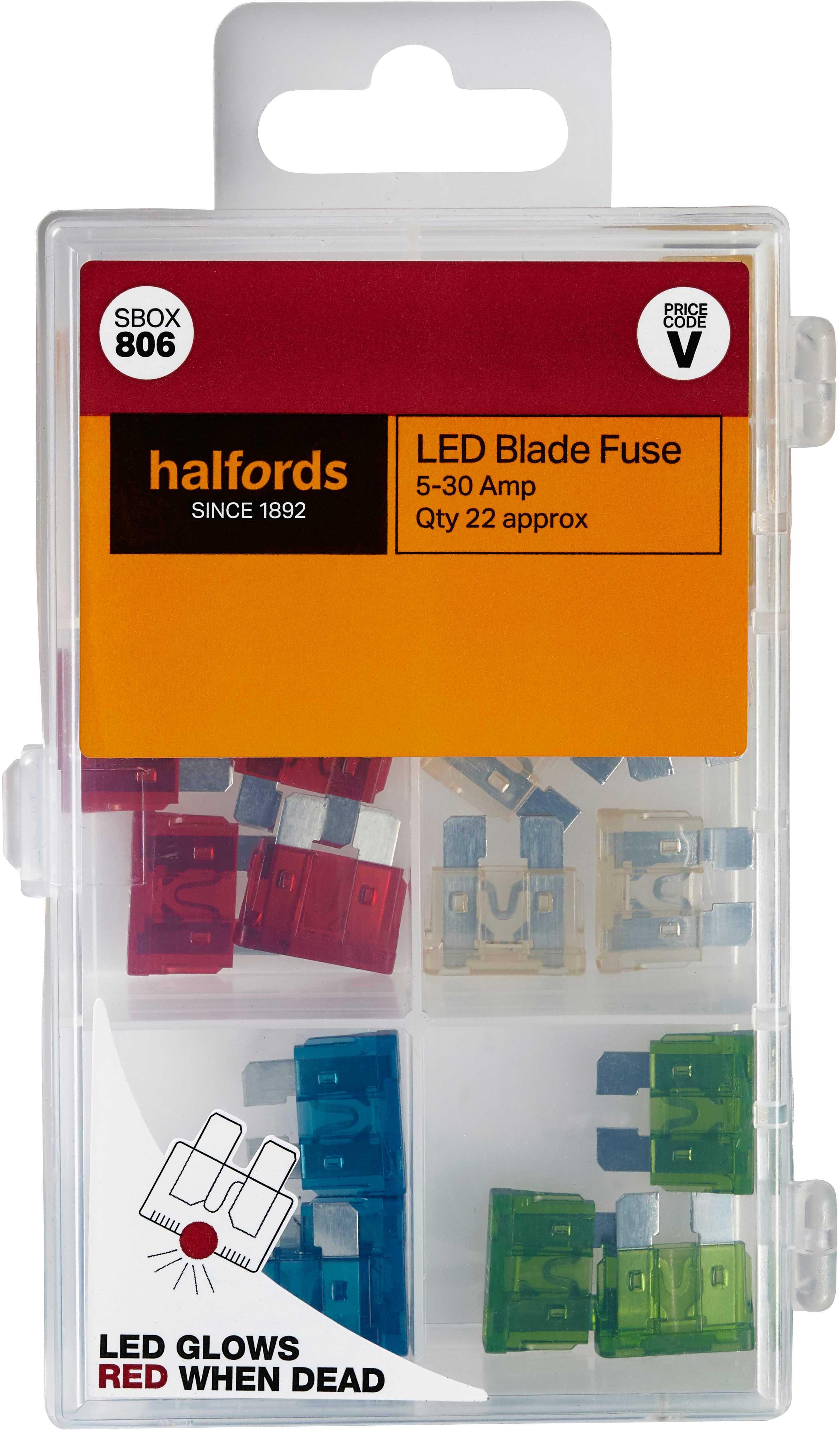 The Halfords Assorted LED Blade Fuses pack contains approximately 22 fuses with built in LED indicator, which lights up when the fuse is blown.