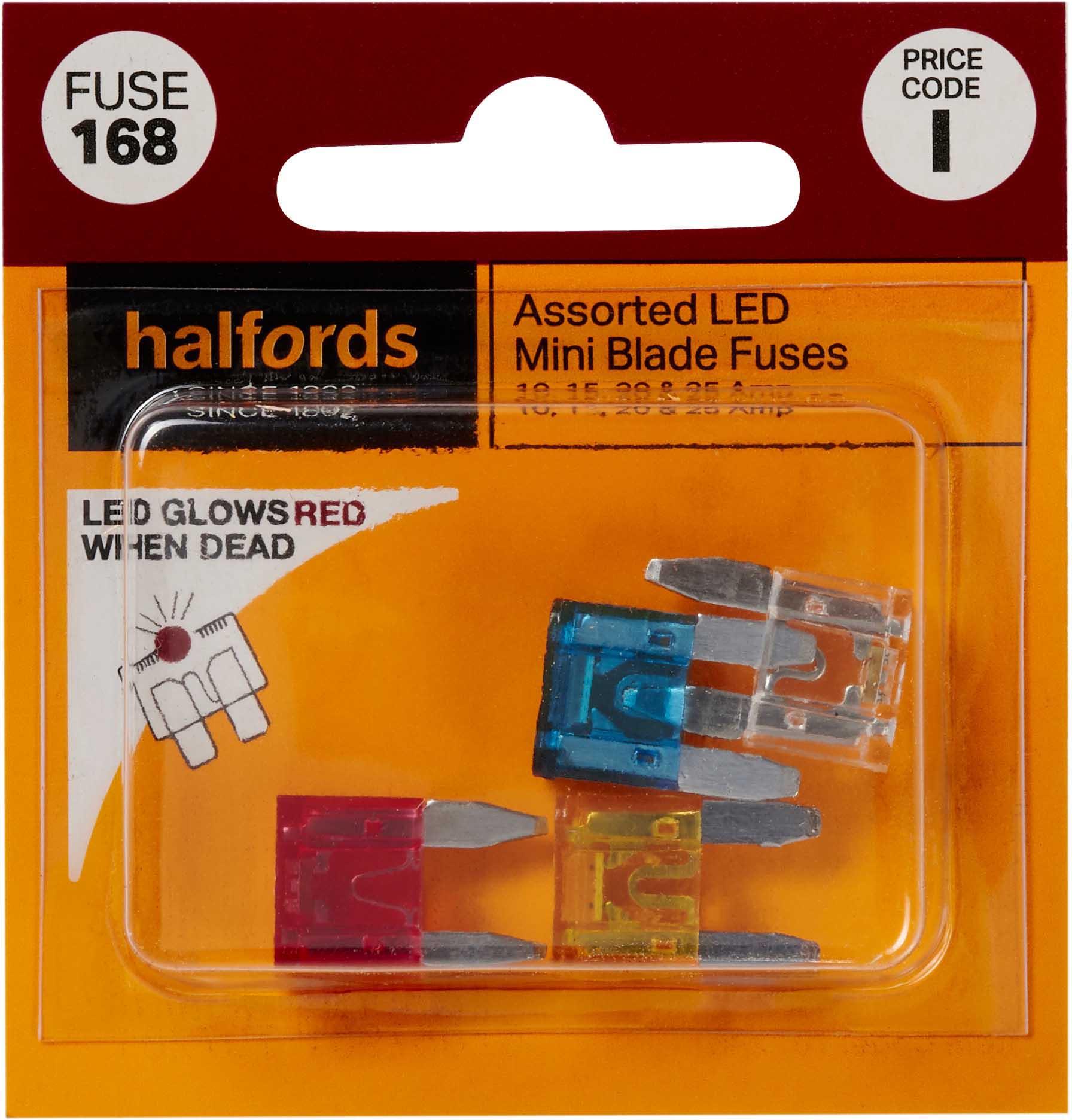 The Halfords Assorted LED Mini Blade Fuses 10/15/20/25/30 AMP (FUSE168) pack contains an assortment of 5 LED mini blade fuses; 10/15/20/25/30 AMP, 12v & 24v. The LED glows red when the fuse is blown.