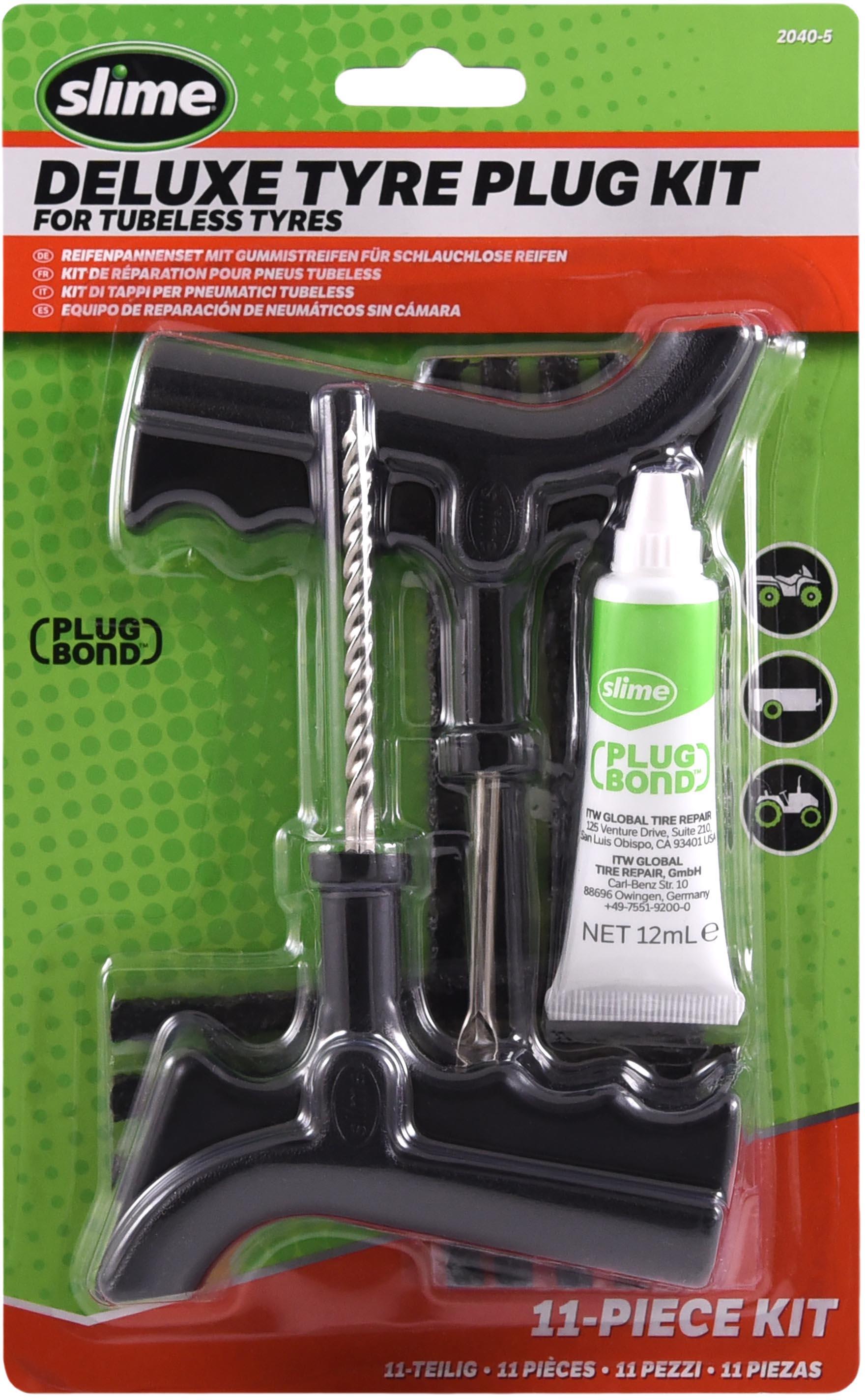 11-piece kit to repair tubeless tires on cars, SUVs, motorcycles, quads, ATVs, lawn mowers, trailers, agriculture and many more.