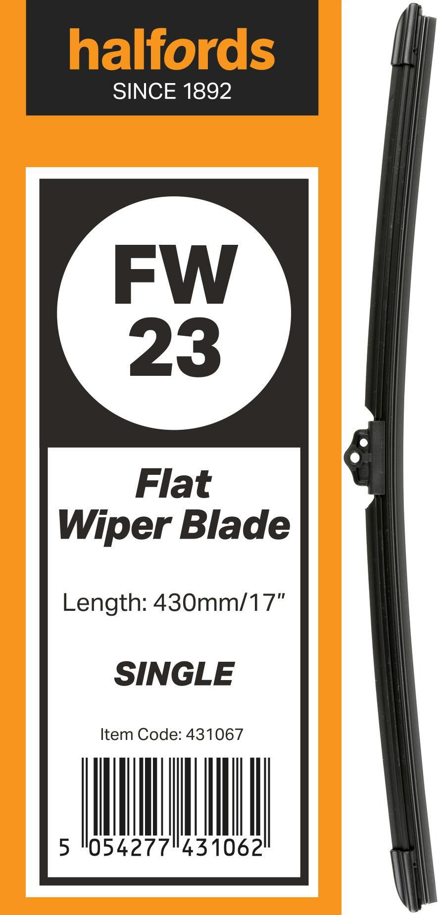 The Halfords Flat Wiper Blade Single FW23 front single flat wiper blade features a built-in aerodynamic spoiler and technological tensioned metal strip for precise uniform distribution of pressure along the wiping edge. This helps to keep the blade closer to the windscreen, ensuring clear vision at high speeds and reduced wind noise.