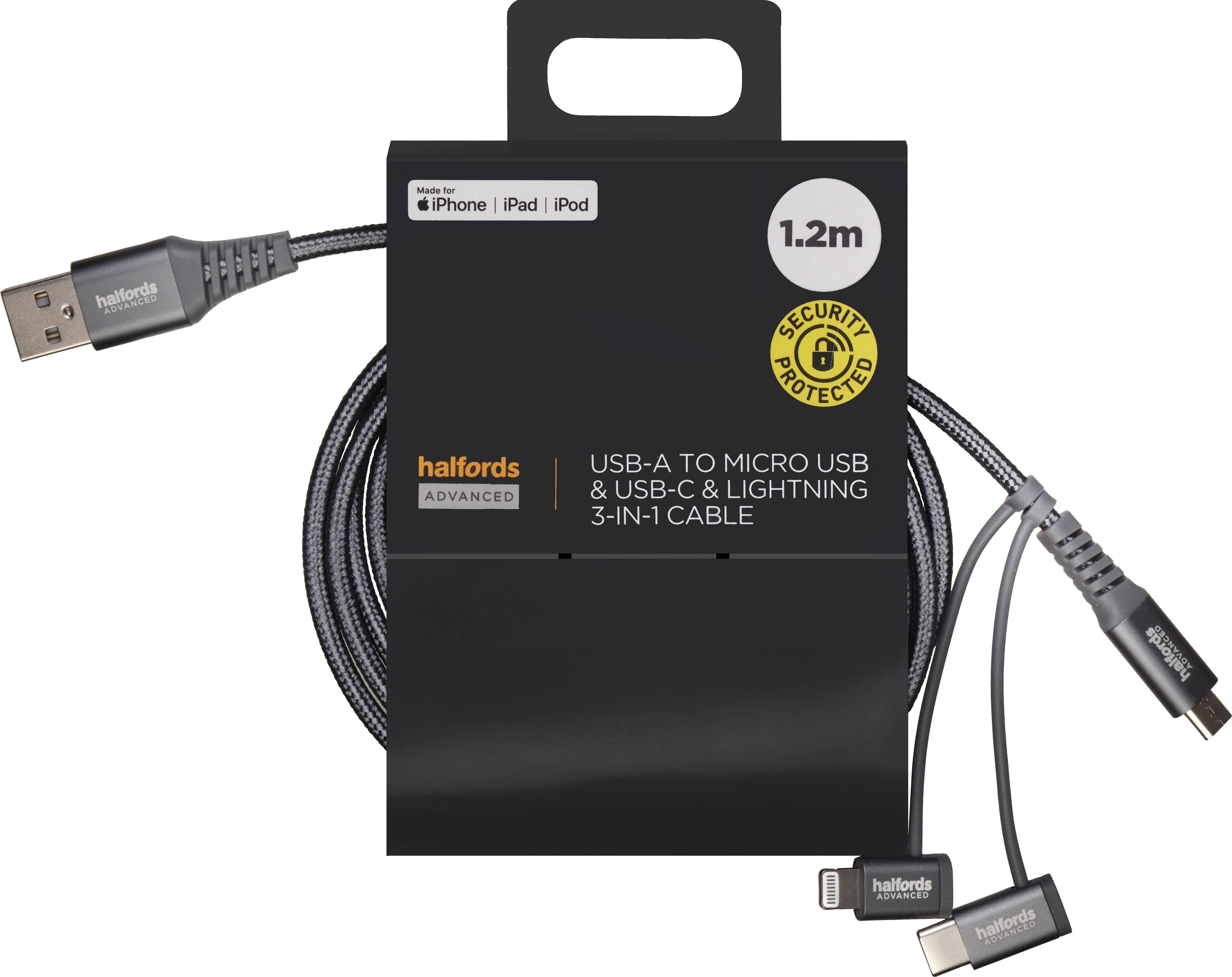 The Halfords USB-A to USB-C & Lightning 1.2m Cable (Charcoal) offers fast and reliable charging and data transfer for a wide range of USB-C and Lightning-enabled devices. Its durable braided design ensures long-lasting performance, while the 5V/2.4A output supports up to 12W of power for efficient, time-saving charging. Combining practicality with a sleek, modern appearance, this cable is ideal for keeping multiple devices powered and connected at home, in the car, or on the go.