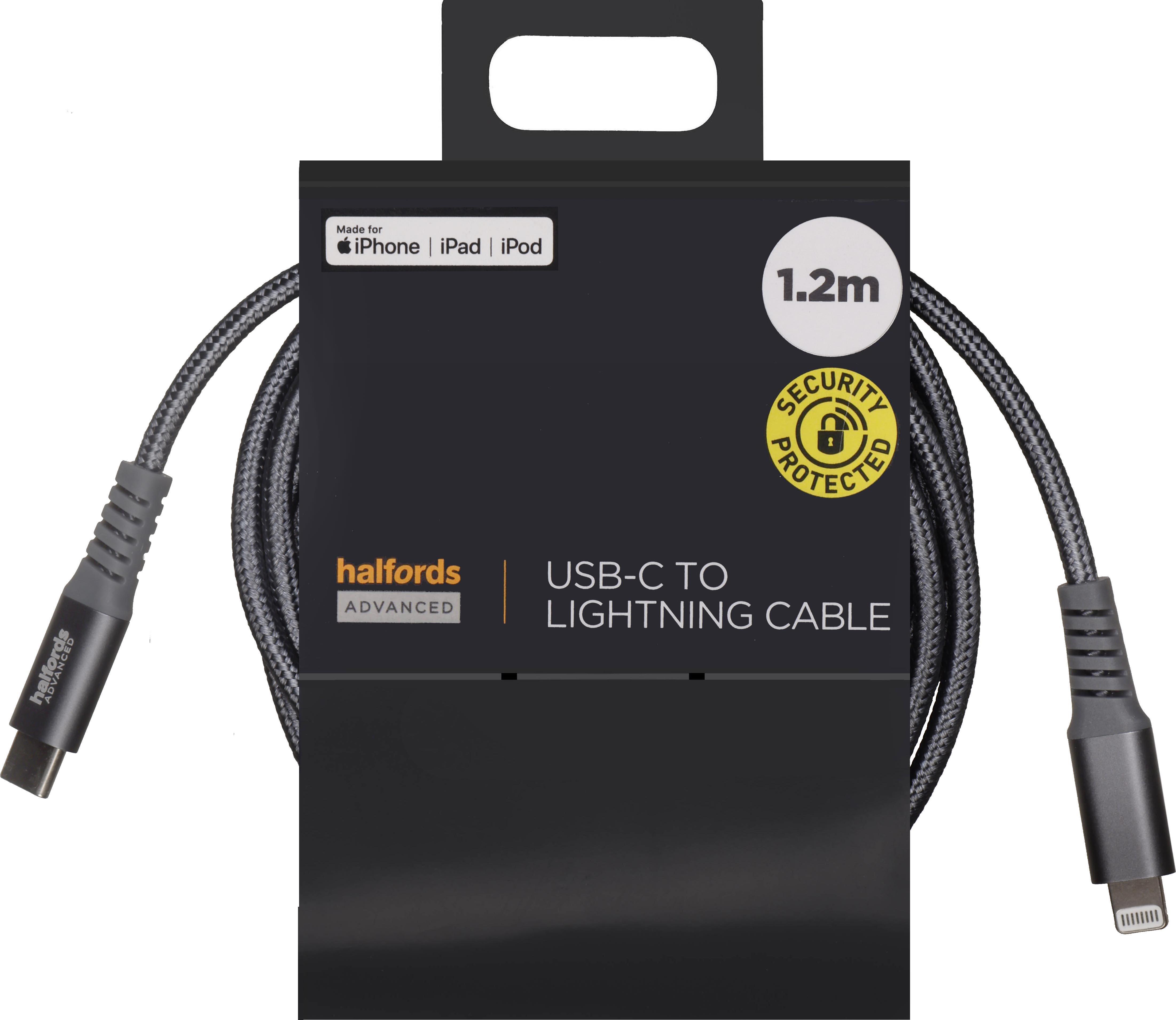 The Halfords USB-C to Lightning 1.2m Cable (Charcoal) delivers fast and reliable charging and data transfer for a wide range of Lightning-enabled devices. Featuring a durable metal head, it is safer at low temperatures and built for stronger, long-lasting performance. With smart power supply technology and PD (Power Delivery) support up to 20V/3A (60W), it provides rapid, efficient charging for compatible devices. Combining durability, efficiency, and modern design, this cable is ideal for keeping your devices powered anytime, anywhere.