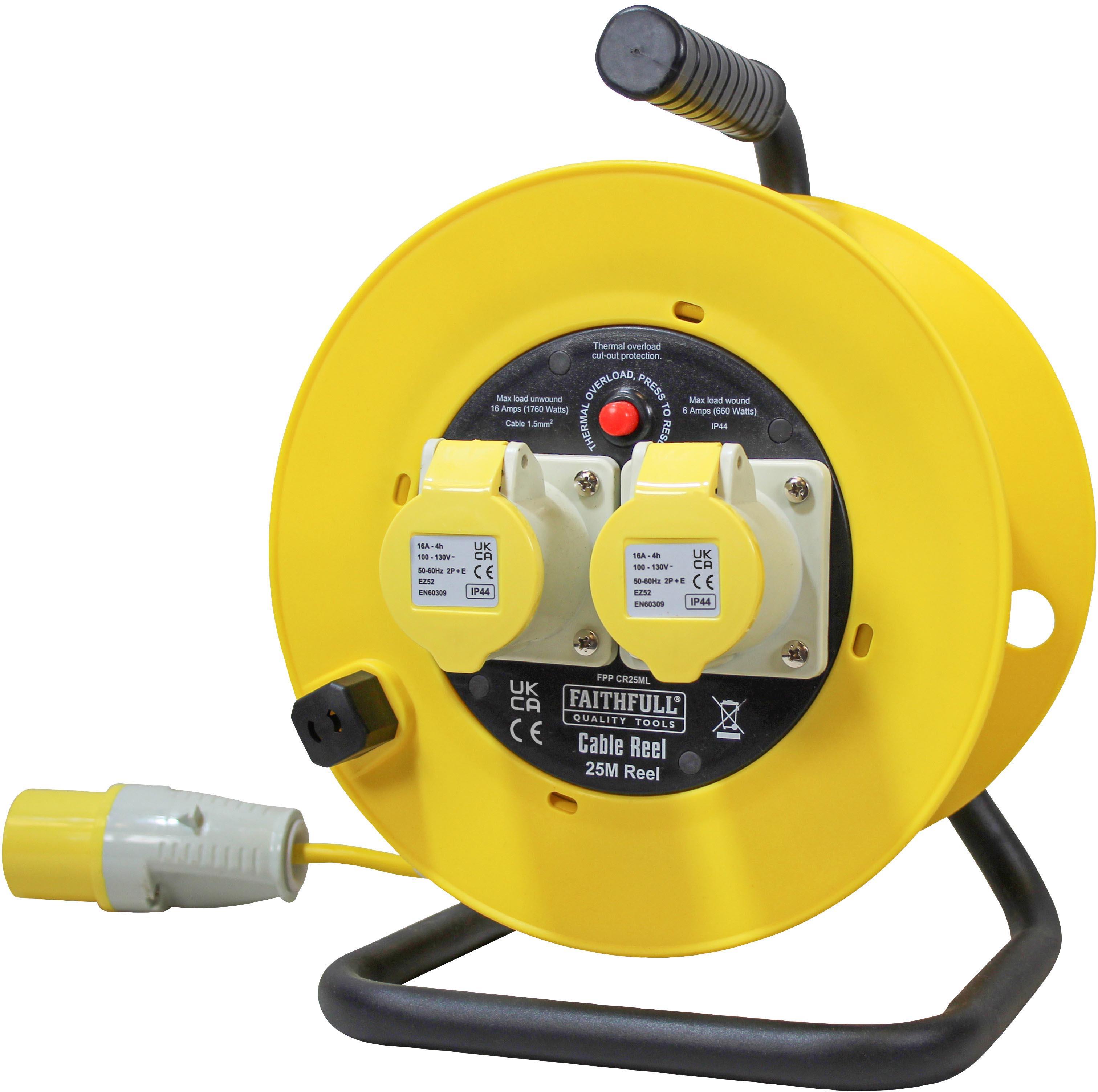 The Faithfull range of open drum cable reels come in a choice of 25m or 50m cable lengths (1.5mm diameter cable) plus a 25m heavy-duty (2.5mm diameter cable) version for larger site applications - all of which are fitted with thermal overload protection and are manufactured to British Standard BS EN 61242.