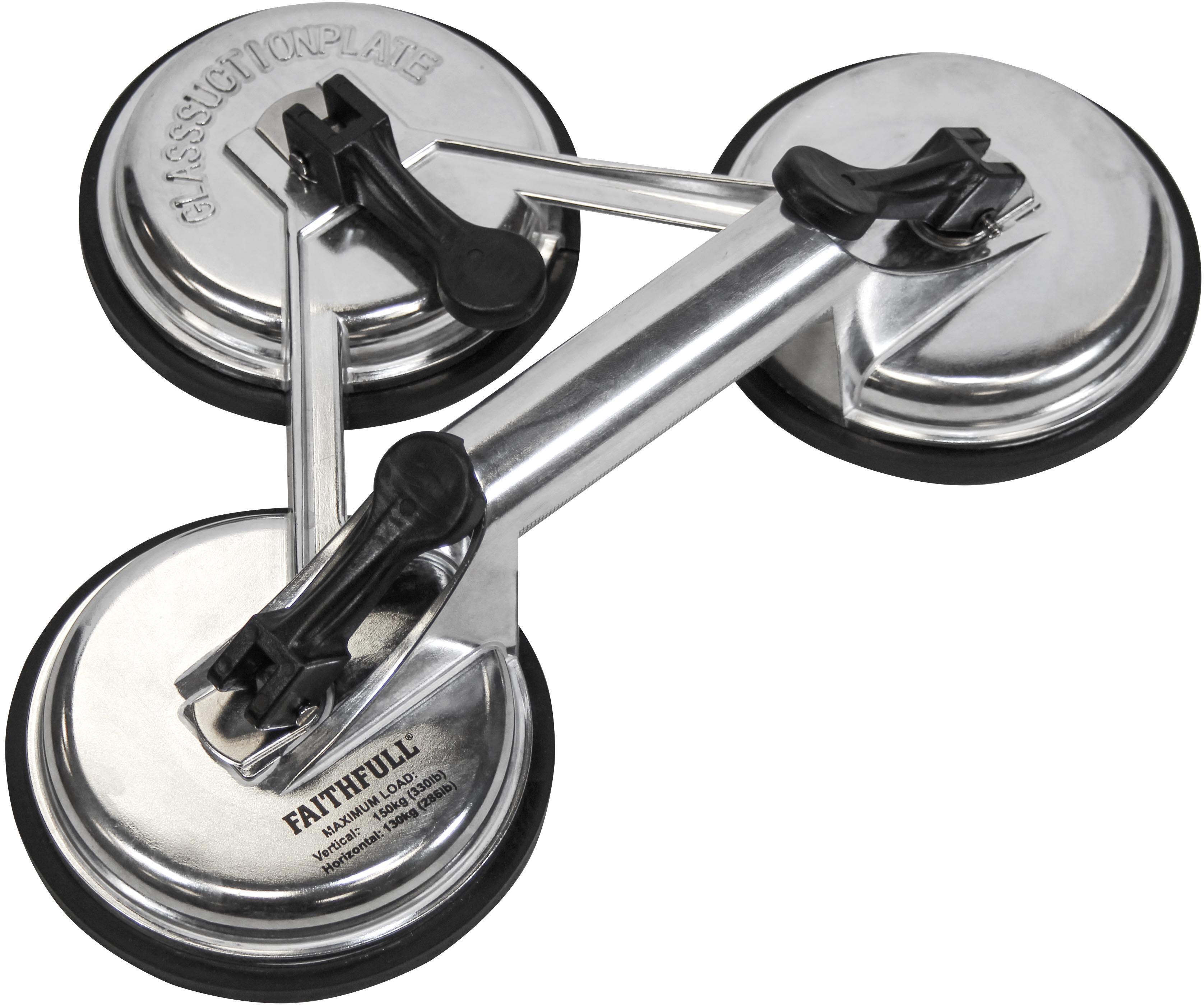 This heavy-duty aluminium bodied suction lifter will grip to most flat surface non-porous materials and is ideal for use when handling heavy, awkward and hard to hold items such as glass, sheet metal, large tiles, marble and many other materials during building installation and servicing. The Faithfull Triple Suction Cup Lifter has three 120mm rubber gripping pads, each fitted with a simple lever action, locking vacuum systems. Three pads provide an increased lifting capacity, added safety and security by spreading the total load. The vacuum system will support loads of up to 150kg (330lbs) when used in a vertical orientation and up to 130kgs (286lbs) when used in a horizontal orientation. Ideal for use on glass doors, windows, sheet metal, tiles, and marble during installation. Maximum lifting capacity 150kg. CAUTION: Care should always be taken when calculating the total load to be lifted. DO NOT EXCEED THE MAXIMUM LOAD.