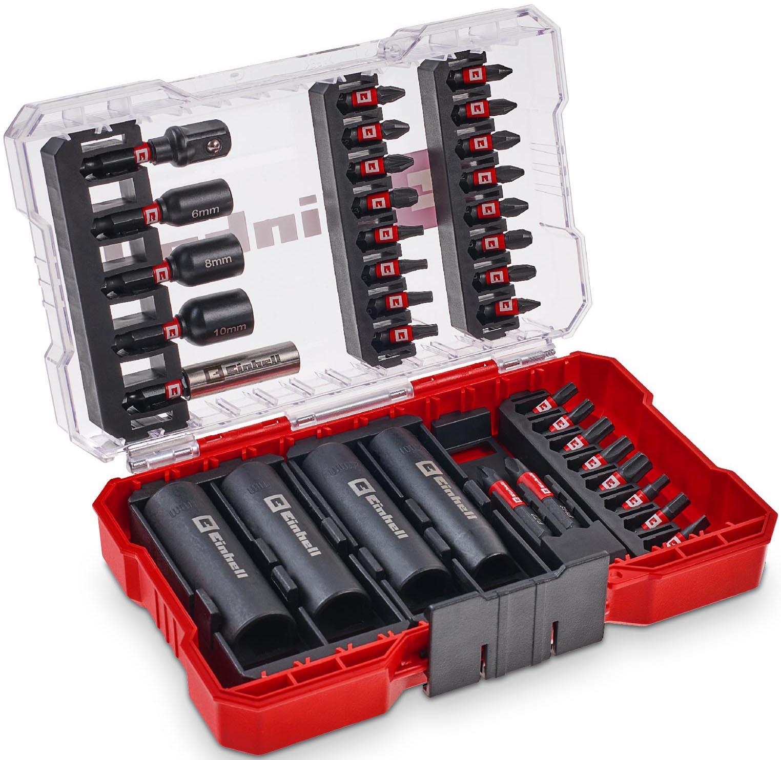 The Einhell set can be used universally and is compatible with all standard drill chucks and bit holders in commercially available (impact) cordless screwdrivers and drills. The individual components are stored in a practical storage box with a robust auto-lock clip closure. Equipped with a transparent lid, the accessories can be recognised at a glance, making it easy to select the right Einhell tool. In addition, interchangeable inserts offer maximum flexibility to mix and match the contents as required. This makes the 35-piece bit and socket set the perfect solution for use in the automotive industry, in mechanical engineering and for DIY projects, as it impresses with its combination of durability and the ability to reach deep-set screws.