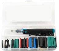 Heat shrink tool kit featuring a rechargeable flame-free heat tool that provides a gentle, even heat for consistent results every time. The tool is light and easy to use with a bright LED task light for improved visibility in low light areas. The lithium battery is charged via a USB port for quick charging and a long battery life. A wide selection of tubing from 2mm to 9mm diameter is also included as well as a stand, USB cable and nozzle cover to protect the tool when not in use. A useful kit for professional wiring insulation repair and maintenance work.