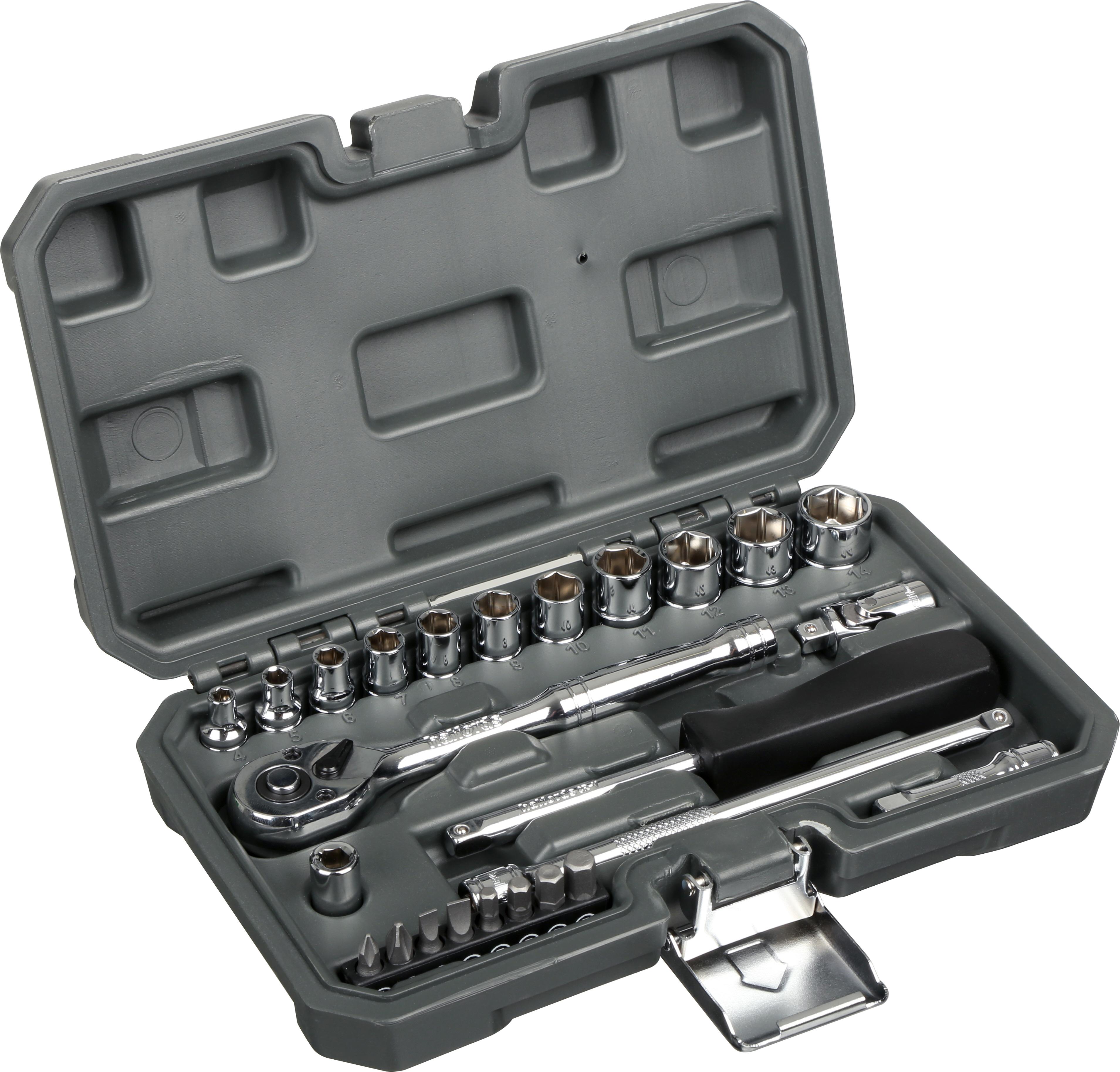 • 11 x 1/4" drive sockets: 4, 5, 6, 7, 8, 9, 10, 11, 12, 13 and 14mm