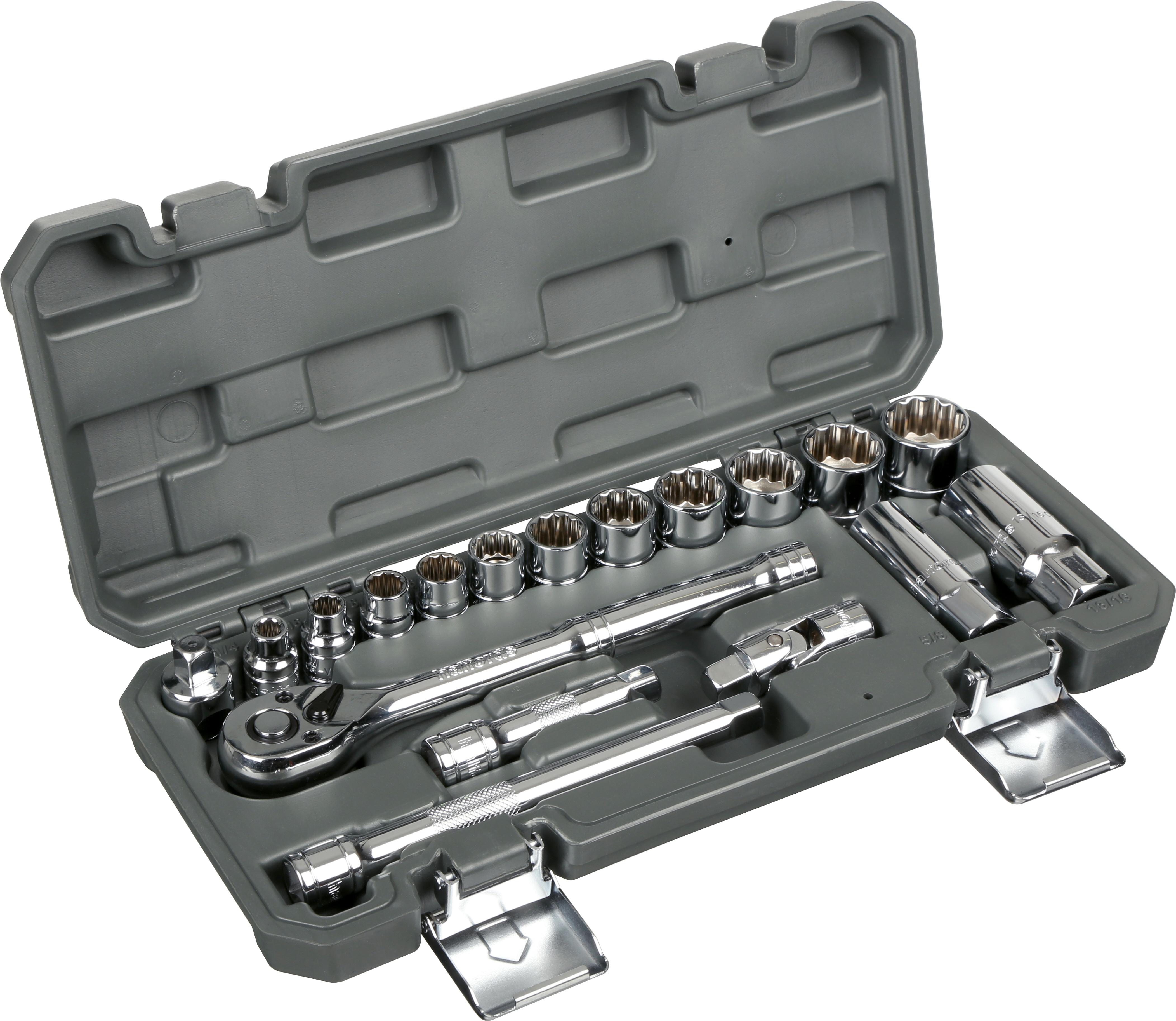 • 11 x 3/8" drive 12-point imperial sockets: 1/4, 5/16, 3/8, 7/16, 1/2, 9/16, 5/8, 11/16, 3/4, 13/16 and 7/8"