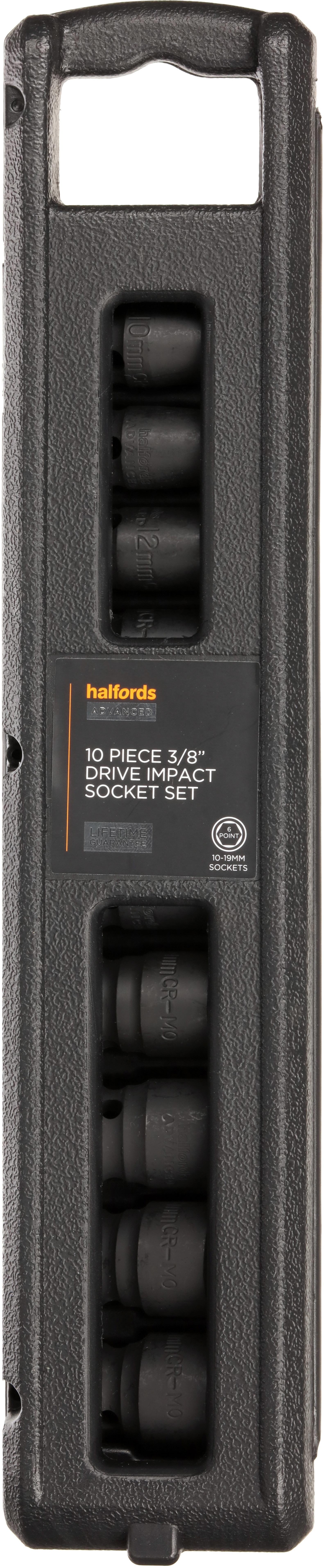 The Halfords Advanced 10 Piece 3/8" Drive Impact Socket Rail Set includes a wide range of metric sockets. They’re made from advanced quality chrome molybdenum steel, which provides a combination of strength, durability and protection against corrosion.