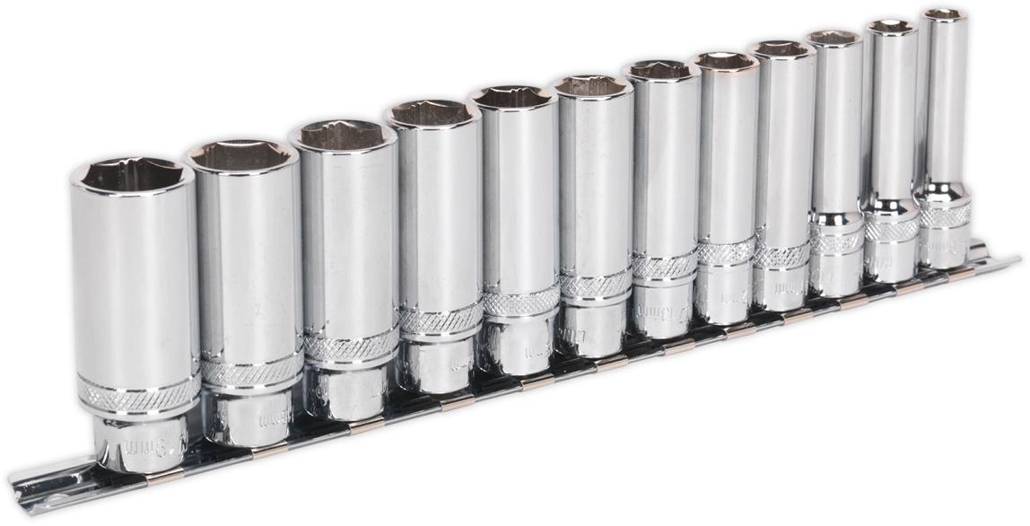 The Sealey 12pc 3/8" Sq Drive Deep Lock-On™ Socket Set includes deep sockets from 8-19mm supplied on a socket rail. The sockets feature specially machined flutes in the walls of the socket which enable use on up to 85% rounded fasteners. This not only provides added strength but also prevents damage to worn or rusted fixings. Manufactured from hardened and tempered high grade Chrome Vanadium 6142 steel, the fully polished mirror finish provides resistance to corrosion.