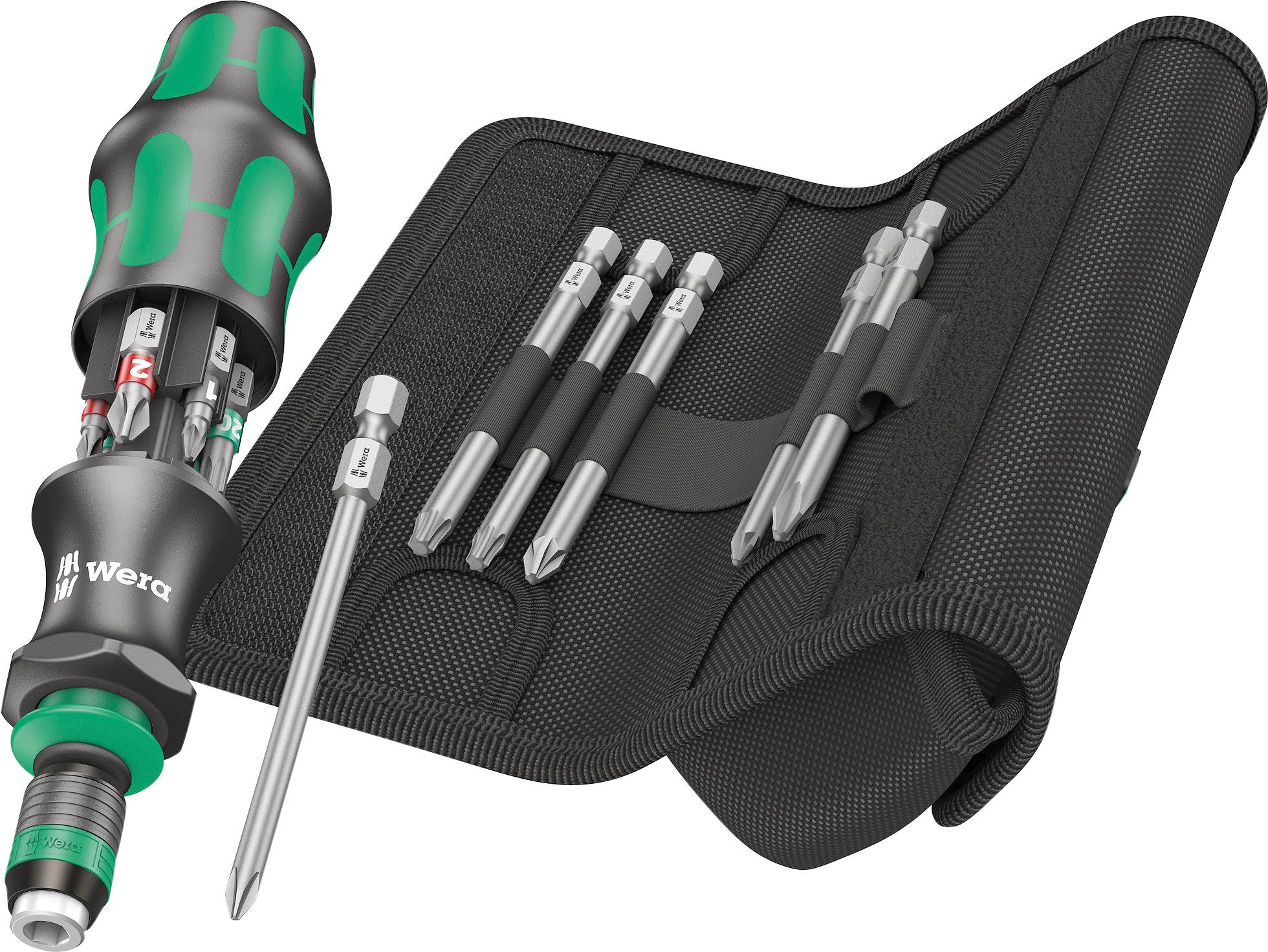 7-piece Kraftform Kompakt set with 6x 25mm long and 6x 89mm long bits. Wera’s compact tools allow you to use both manual or assisted maintenence.
