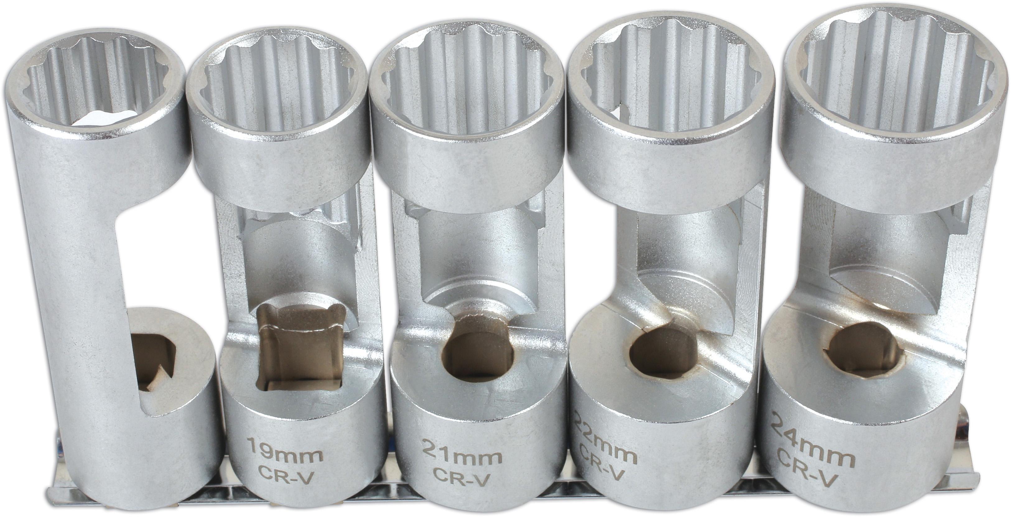 A set of five Bi-Hex (12pt) sockets with cut away profile for removing and replacing strut nuts. Covers most popular sizes for European vehicles.