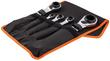 Switch for quick change of right and left direction. 12-point Dynamic-Drive™ profile provides longer life for screws and nuts. Chrome plated matte finishing provides high quality anti-rust protection. High-performance alloy steel. Quicker turning of fastener from the ratcheting action. Four sizes per wrench, one wrench is useful for four screw sizes. Easier to use in confined spaces with 5° operating angle. Available in practical pouch to carry on your belt.