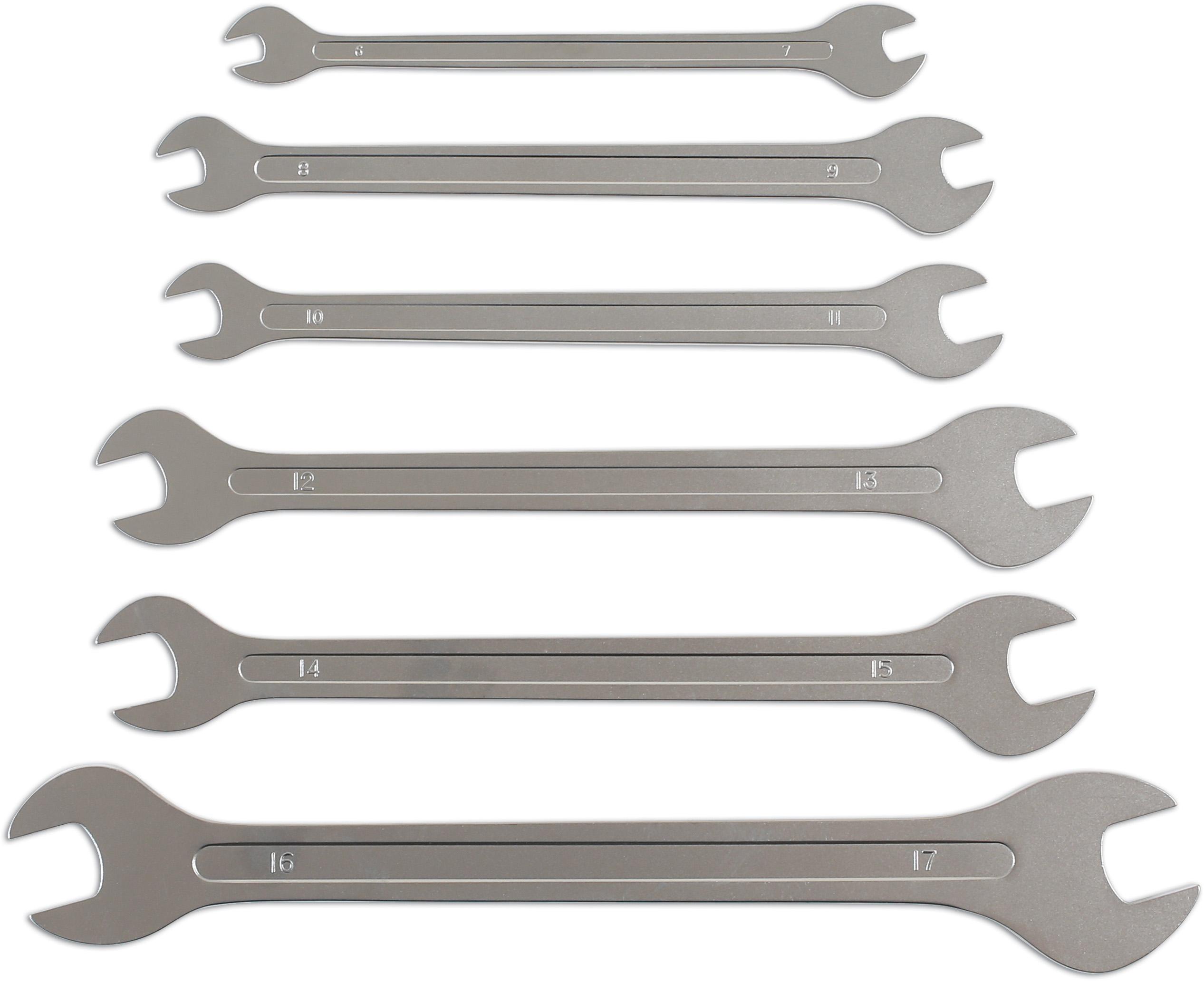 Double ended, ultra thin open ended spanner set 6mm to 17mm, ideal for areas of poor access and undoing slim lock nuts.