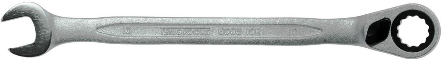 A ratcheting ring and open ended spanner combined with the same size at each end; Off set at 13° for easier use on flat surfaces; TengTools hip grip design on the ring end for contact with the flat side of the fastening; 72 teeth ratchet spanners giving a 5° increment between clicks; Reversible ratchet mechanism with a flip reverse lever; Ideal for rapid tightening and loosening of fastenings; Chrome vanadium satin finish; Designed and manufactured to DIN ISO 1711-1 and DIN 3113A.