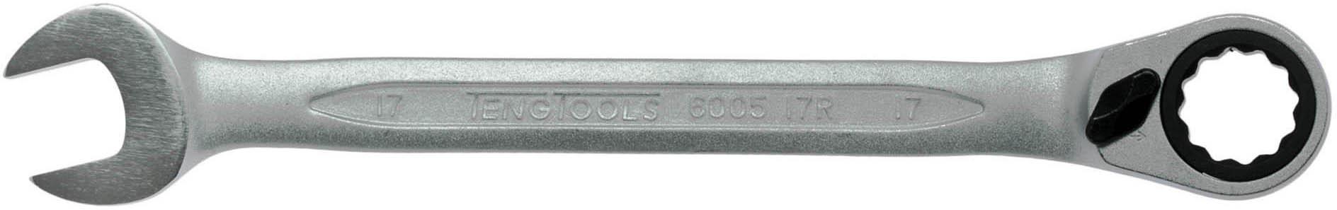 A ratcheting ring and open ended spanner combined with the same size at each end; Off set at 13° for easier use on flat surfaces; TengTools hip grip design on the ring end for contact with the flat side of the fastening; 72 teeth ratchet spanners giving a 5° increment between clicks; Reversible ratchet mechanism with a flip reverse lever; Ideal for rapid tightening and loosening of fastenings; Chrome vanadium satin finish; Designed and manufactured to DIN ISO 1711-1 and DIN 3113A.