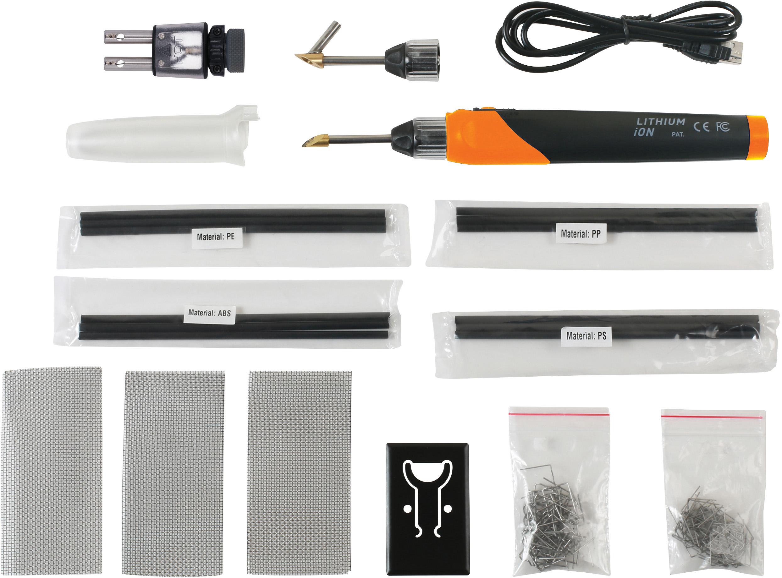 Cordless plastic repair kit, including welding tip hot stapling function, welding rods, wire mesh, stand & USB charging cable.