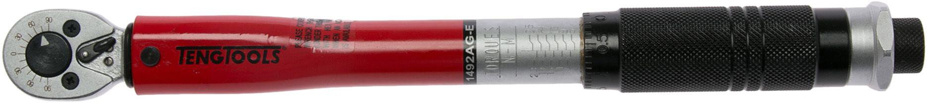 This Teng Tools torque wrench is manufactured according to DIN 3122 standards. With a ratchet head, the torque wrench can be used for both tightening and final checking of the torque. It is reversible with its lever but only for right hand action when torque checking. The wrench is equipped with an angular gauge for after tightening. It is graduated in both Nm and ft.lb, and has a degree scale for after tightening of cylinder heads.
