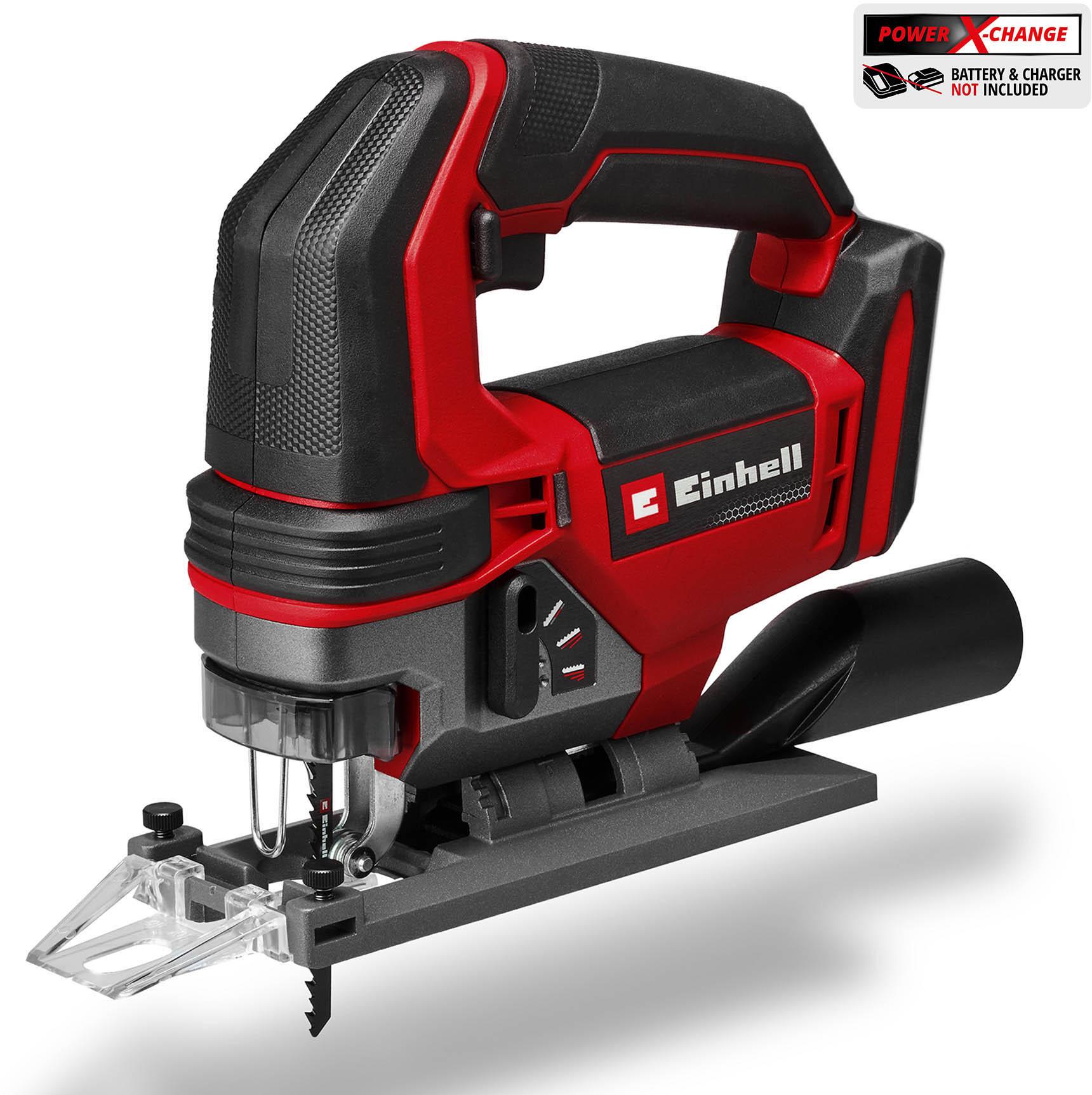 It also features a convenient cutting line indicator and an LED light for illuminating the cutting area. The electronic speed control enables the tool to be perfectly matched to the material and task at hand. The toolless saw blade holder allows quick and easy changes of saw blade. The jigsaw can be used with all standard U- and T-shank saw blades. Optimum visibility when working is ensured by the dust blow-off function and the included suction adapter, which can be connected to an Einhell wet/dry vacuum cleaner with a Ø 36-mm connector, for example.