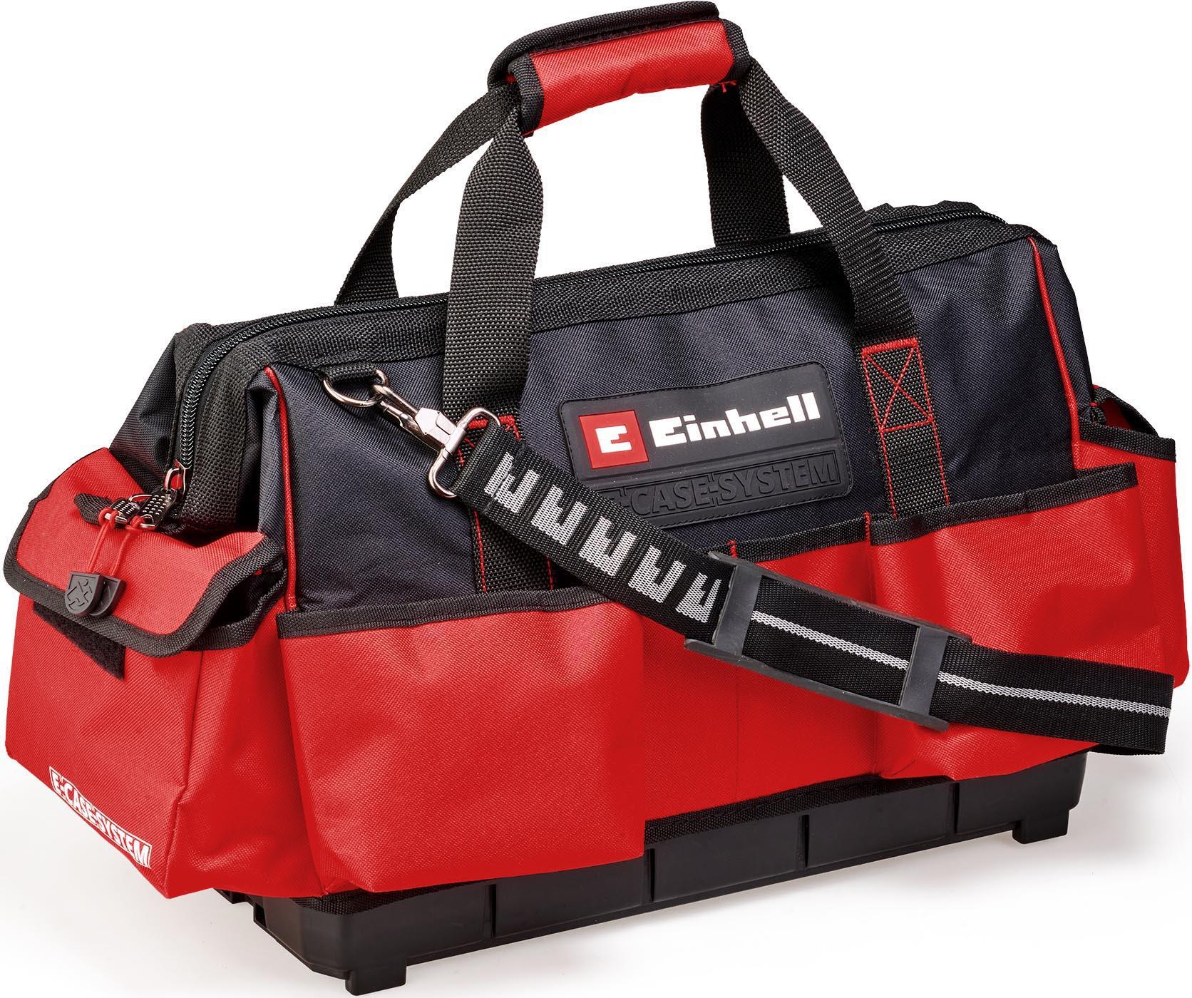 The original Einhell E-Case Bag is part of the modular E-Case system from Einhell. The bag is ideal for storing and transporting equipment, tools and accessories up to a maximum of 30 kg. A convenient latching system to connect stacked boxes and cases ensures tidy storage and enables safe transport. Featuring 6 large external pockets for items such as batteries and charging devices, and various inside pockets for hand tools such as screwdrivers, the system bag provides plenty of space for all kinds of items. One of the larger inside pockets has a zip, providing a place to safely store a notepad or tablet. The carrying strap and the two handles make it easy to transport and comfortable to carry. In addition, the bag includes two clips for a spirit level on the outside. This product consists of an Einhell E-Case Bag with a support structure compatible with the Einhell E-Case system.
